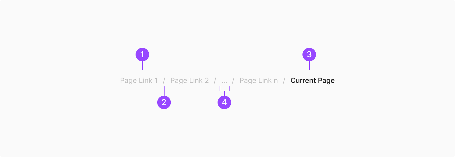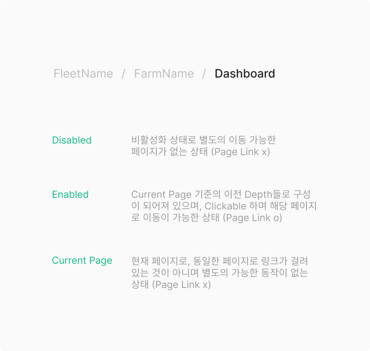 Breadcrumb은 Page의 Hierachy를 보여줌과 동시에 통해 페이지 이동이 가능한 Component 입니다. Current Page를 제외한 Enabled 상태의 Breadcrumb의 Item을 클릭하는 동작을 통해 이동이 가능하며, Current Page가 아닌 Disabled의 상태 또한 별도의 이동이 이루어 지지 않는 것이 특징입니다.