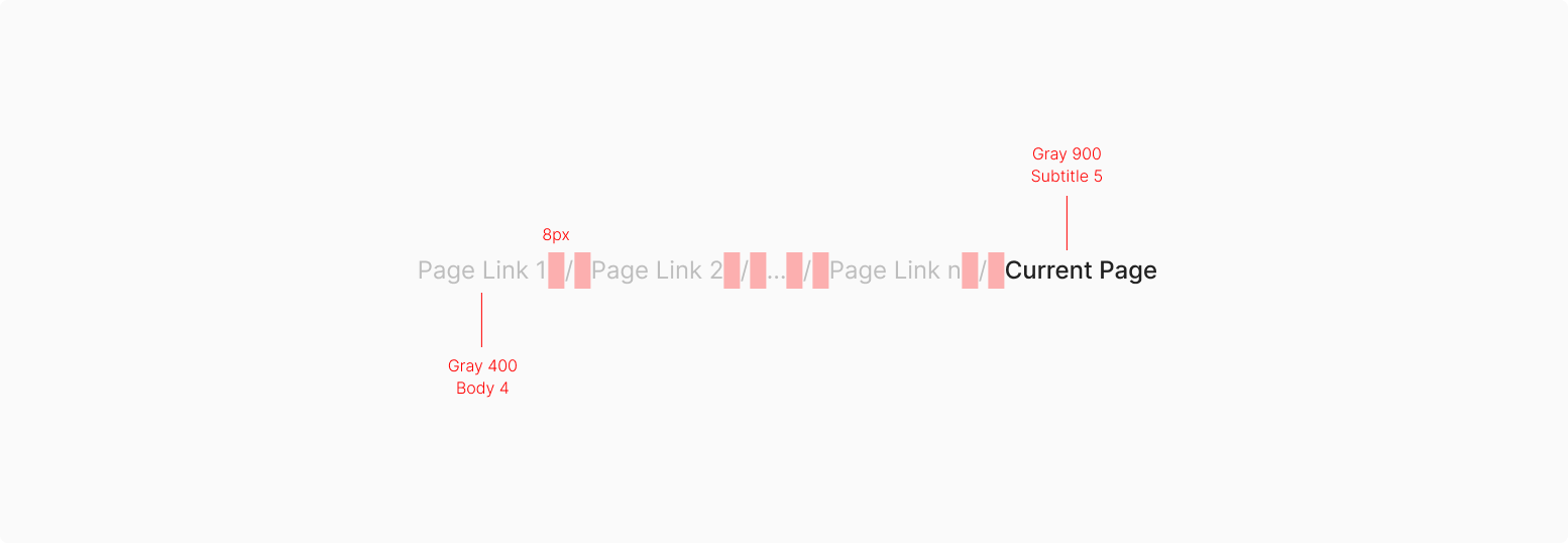 Breadcrumb의 사용 spacing은 각각의 간격을 8px로 두며, 현재 페이지와 이전 hierarchy의 페이지를 Typography 및 Color의 차이를 두어 시각적으로 구분 합니다.