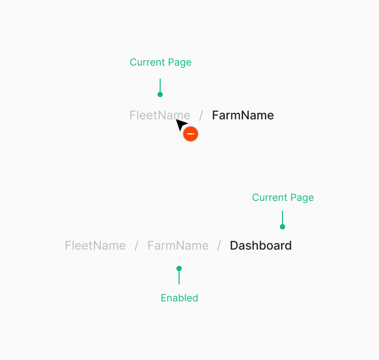 Breadcrumb의 State는 3가지 (Current Page, Enabled, Disabled) 로 구성되어 집니다. Enabled와 Disabled의 경우 시각적 변화는 없으며 Cusor의 변화로 구분하는 것이 특징입니다.