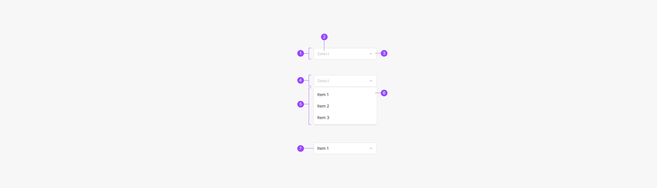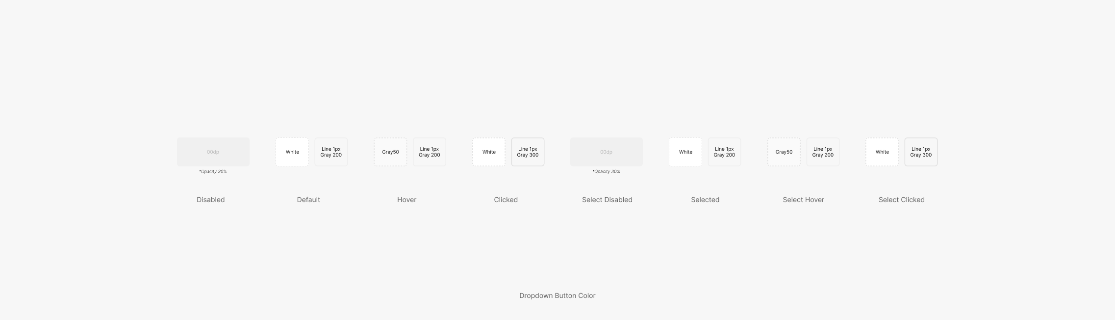 Dropdown Button의 State는 8가지 (Disabled, Default, Hover, Clicked, Select Disabled, Selected, Select Hover, Select Clicked)로 구성이되며, Menu Item의 경우 4가지 (Default, Hover, Selected, Select Hover)로 구성됩니다.