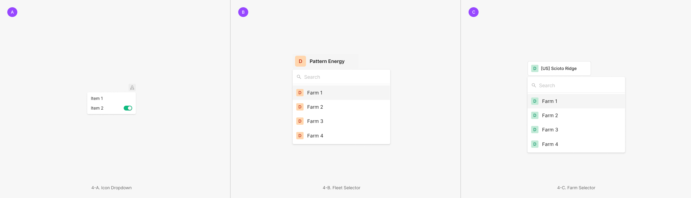 Extra Type은 컴포넌트가 사용되는 기능적 혹은 형태적 목적에 따라서 변경되어 사용되는 Dropdown의 Usecase로 Icon Dropdown, Inspection Selector, Fleet Selector가 있습니다.