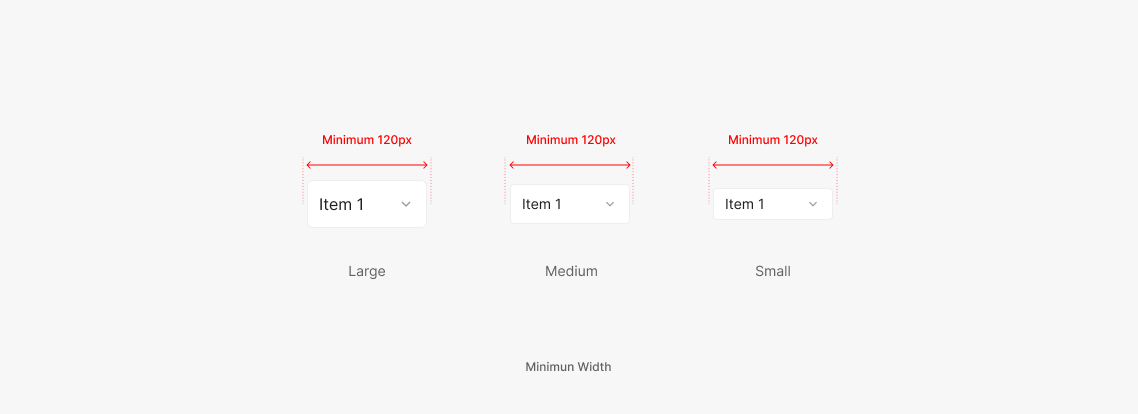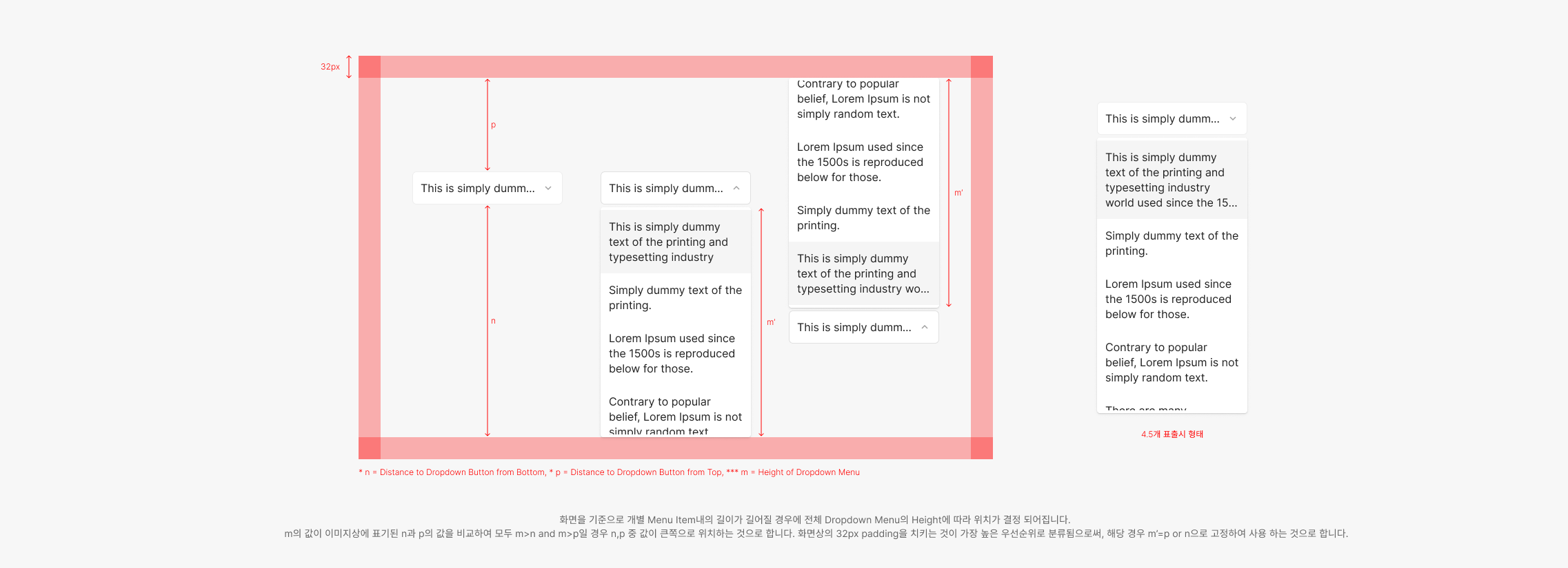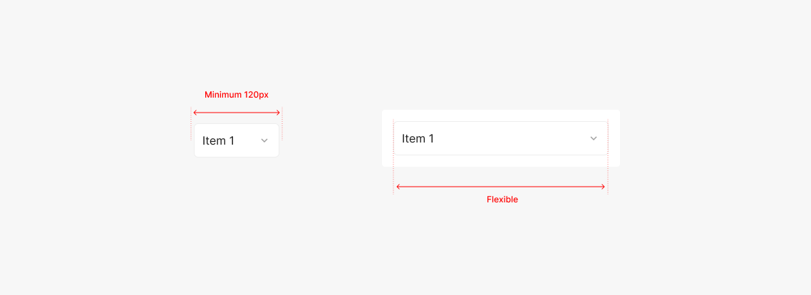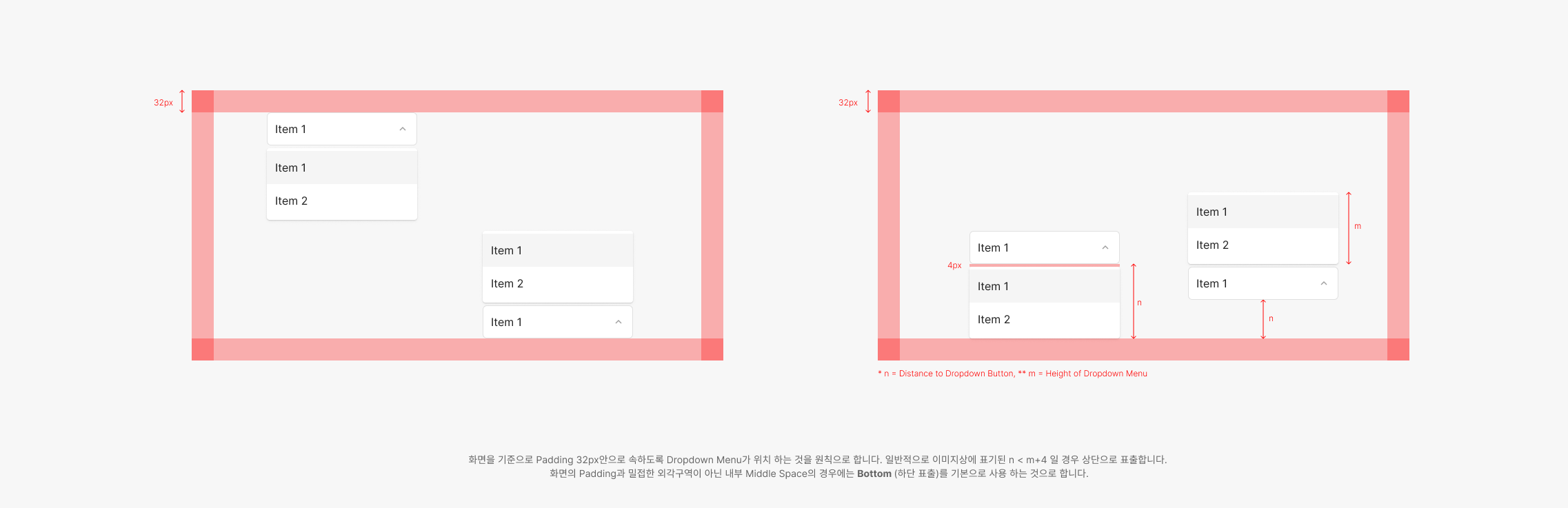 Dropdown의 경우 Flexible하게 사용되어지며 Menu Item에 표출되어지는 Item의 Contents를 적절히 고려하여 Width를 설정 하는 것이 특징입니다. 특정 Parent 요소의 Container 내에 사용될 경우 해당 영역에서 정의된 Padding을 지키는 것을 원칙으로 합니다.
