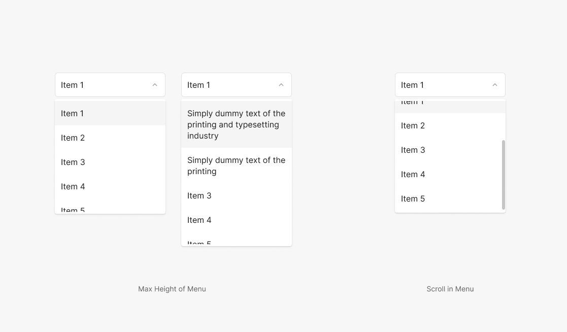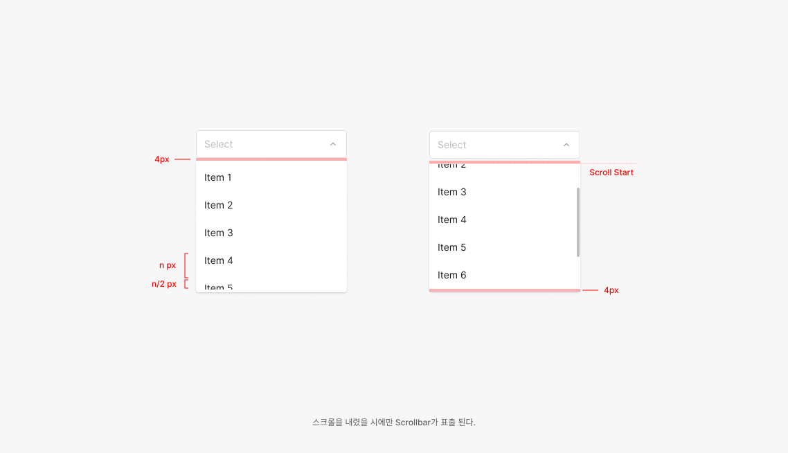 Dropdown의 Menu Item은 최대 4.5개를 표출하는 것을 지향하며, Menu Item이 5개 이상이 포함될 경우 Scrollbar를 사용하여 4.5개를 표출하여 보여지는 것이 특징입니다.