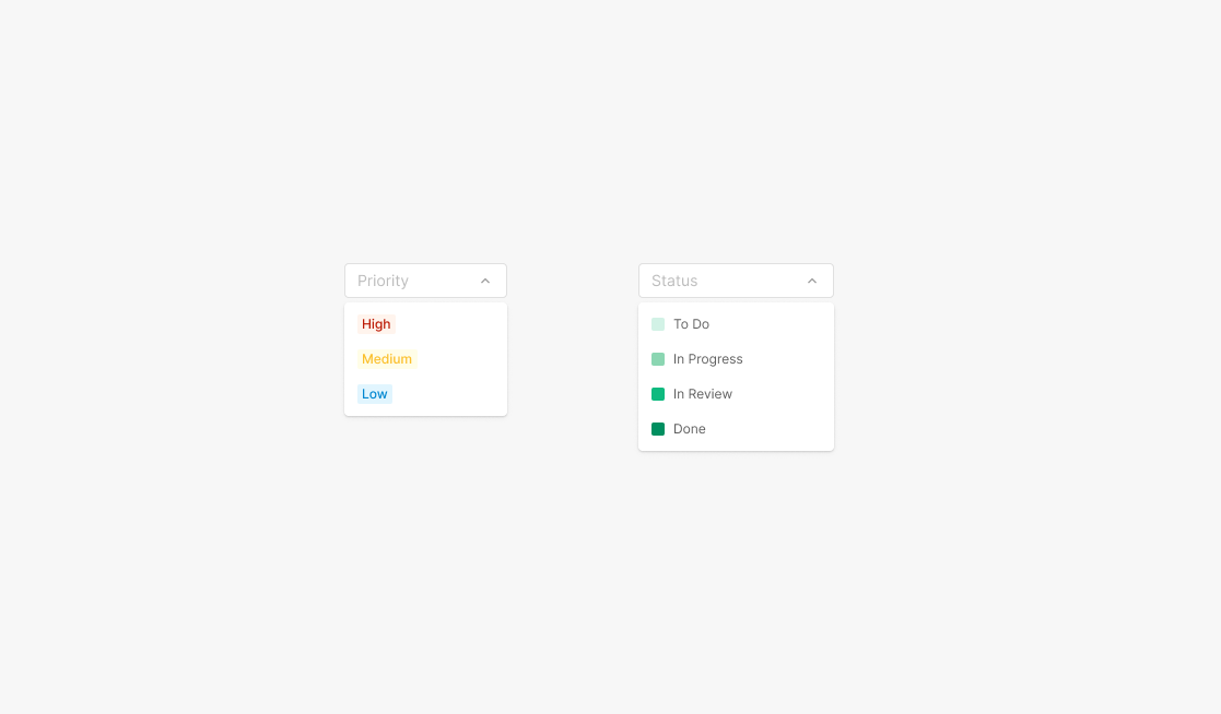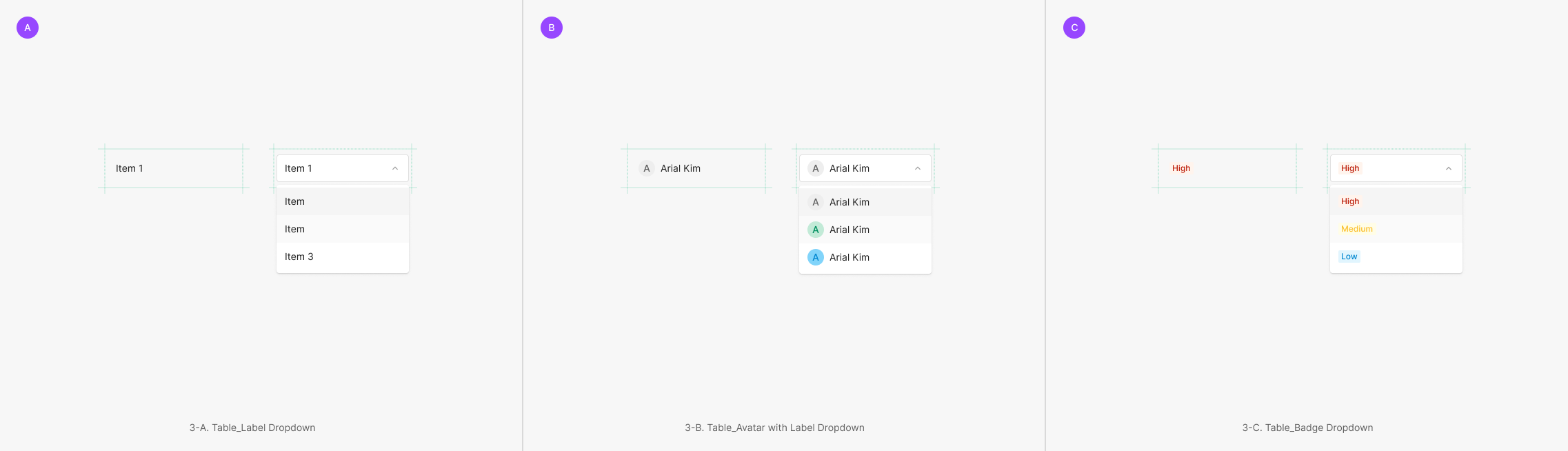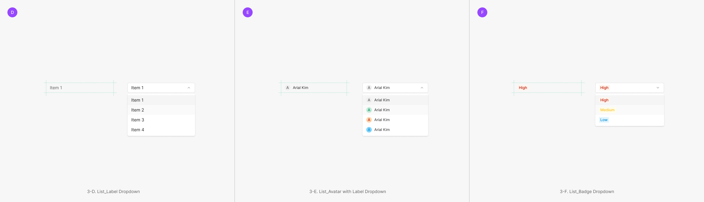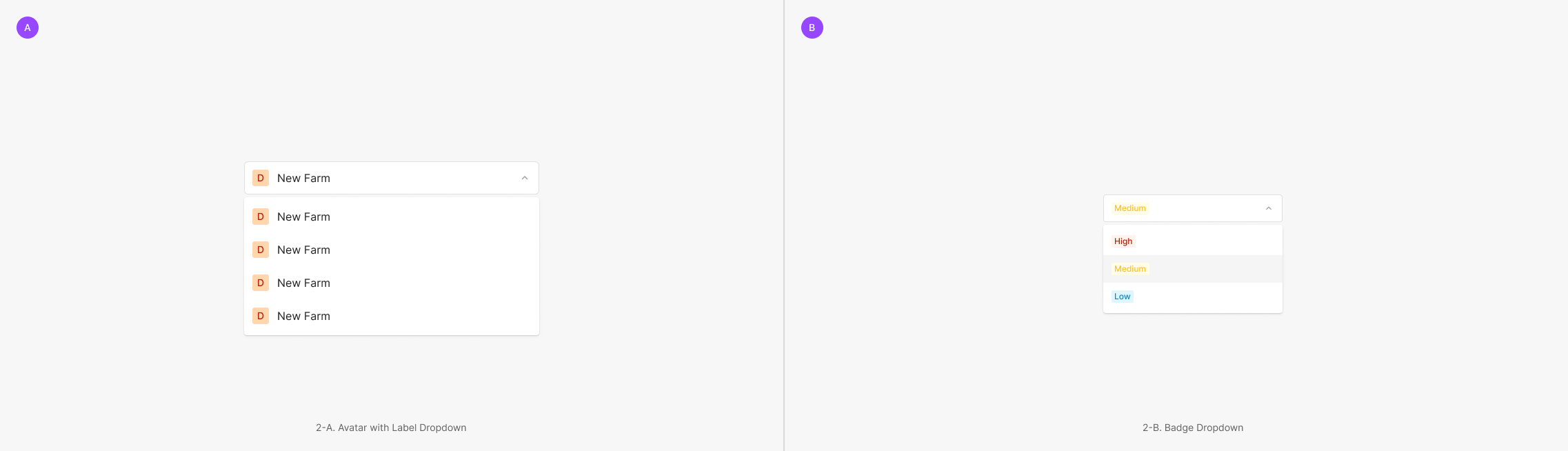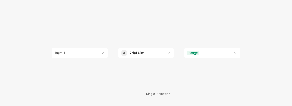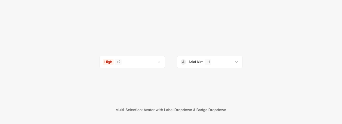 Dropdown Field에 속하는 값은 기본적으로 Text를 포함하는 Label Dropdown으로 구성되어 있으나, 다른 컴포넌트 요소가 사용되기도 합니다. 대표적으로는 Badge, Avatar가 있으며, 경우에 따라 다양한 형태의 Component가 함께 사용 될 수 있습니다.