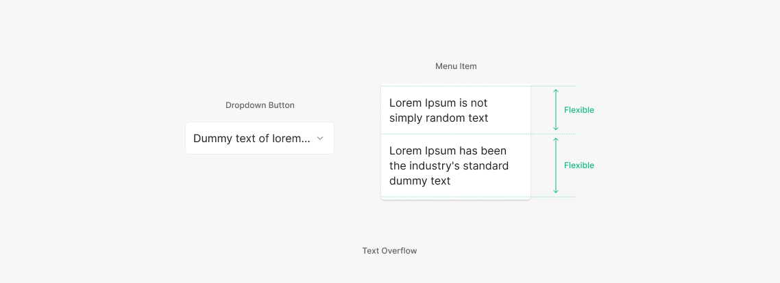 Dropdown Button의 Field 내의 text의 값이 넘치는 경우 horizontal의 영역 지워지는 text값을 '...'으로 표현하여 축약되는 것이 특징입니다. Dropdown의 Menu Item의 경우에는 컨텐츠를 축약하지 않고 줄바꿈하여 모두 보여주는 것이 특징입니다.
