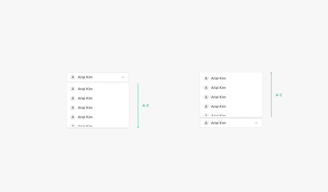 Dropdown의 Menu의 표출 위치는 사용자가 Action을 수행하기 시작한 지점의 해당 화면상에 컴포넌트의 위치에 따라 결정이 되며, 가장 최 상단으로 Positioning 하는 것을 원칙으로 하되, 화면상에 디자인되는 최소 Padding인 32px를 기준으로 넘지 않는 선에서 Positioning 하는 것을 원칙으로 합니다.