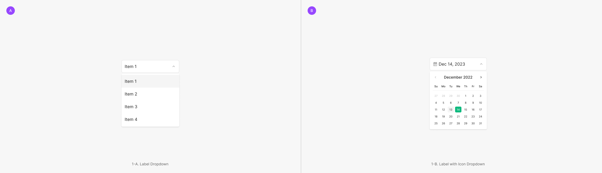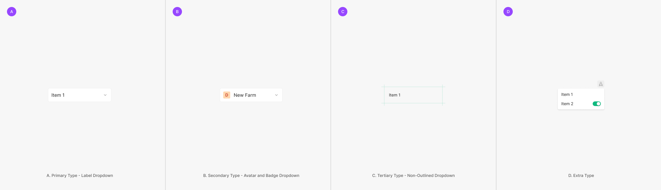 Dropdown은 스타일, 쓰임새 그리고 채워지는 Field의 형태에 따라서 Primary Type (Label Dropdown), Secondary Type (Avatar and Badge Dropdown), Tertiary Type (Non-Outlined Dropdown) 그리고 Extra Type으로 분류되어 사용됩니다.