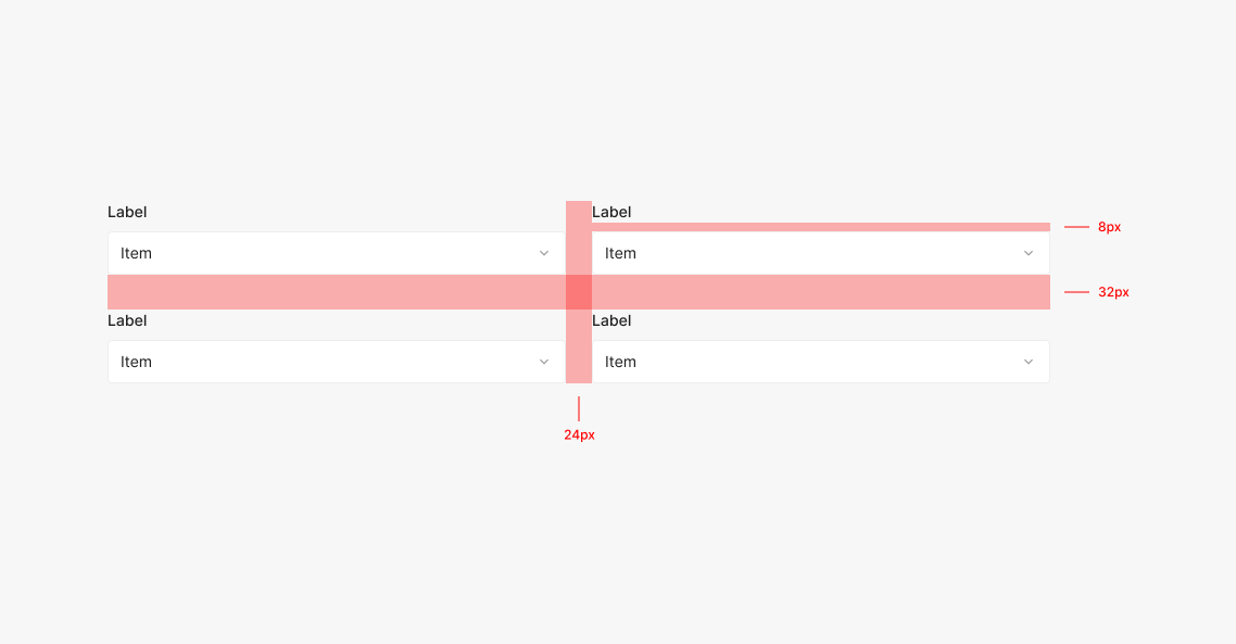Label을 포함한 Dropdown 및 Input의 조합은 여러개가 함께 사용되는 경우가 많습니다. Label과 Dropdown 사이의 간격은 8px, 각 요소 사이의 간격을 가로 배열시 24px, 세로 배열시 32px 두고 배열하여 사용됩니다.