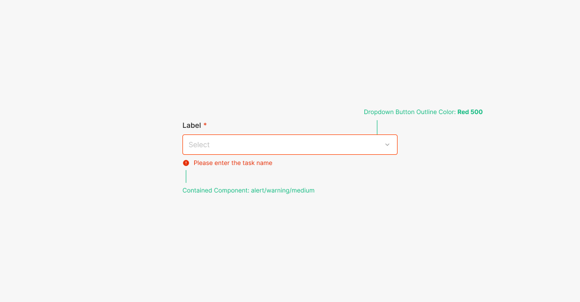 Error 상태의 Dropdown Button Outlined Color: Red500을 사용하며, Medium 사이즈의 Alert를 사용합니다.