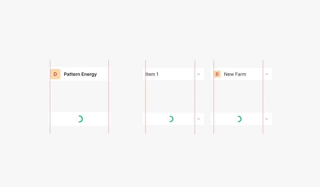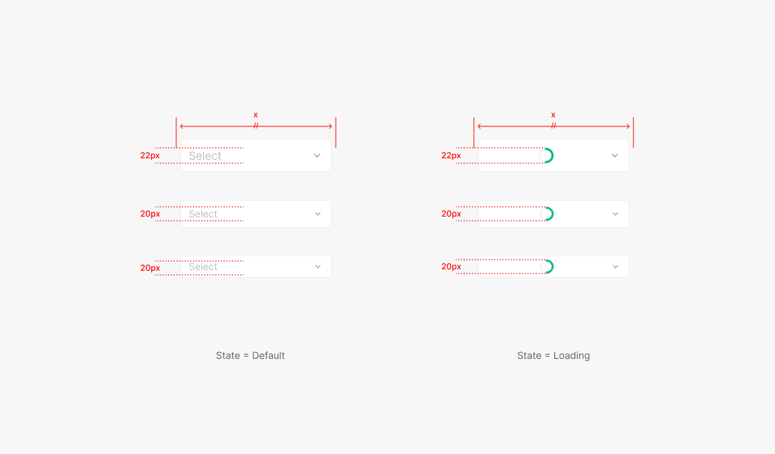 Dropdown Container 내에서 표출되는 Spinner의 경우에 Dropdown 내의 Item으로 표출되는 Text의 Height와 동일하게 맞춰 표출 되는 것이 특징입니다. Loading 표출시에 Width 값의 경우 Loading 발생시점 직전에 사용되는 Width과 동일하게 사용하는 것이 특징입니다.