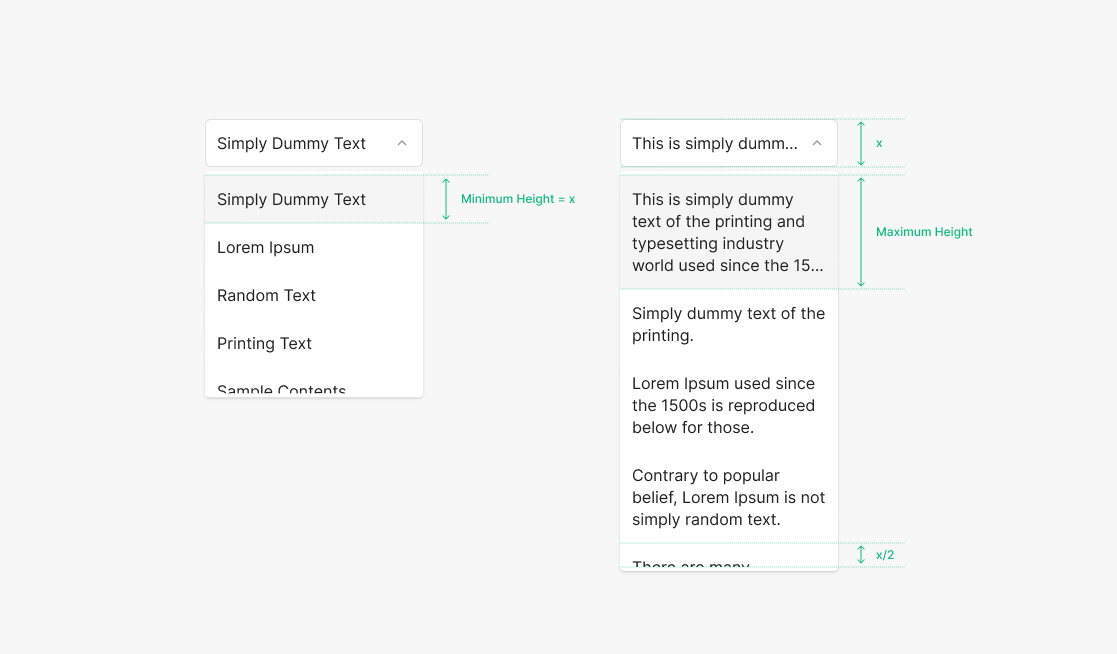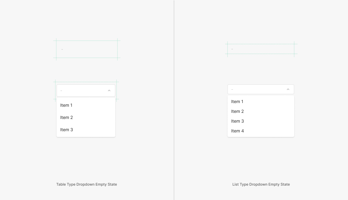 Dropdown의 Menu내의 아이템의 갯수의 Boundary에 따라서 Height가 Flexible 하게 다르게 적용되는 구간과 Height가 Fixed되어 사용되는 지점 두가지로 분류 되어 집니다. 해당 지점의 기준이 되는 Item의 값은 4개로, 4보다 작거나 같은 경우, 4보다 많은 Item을 Menu 상에 표출 하게 됩니다.