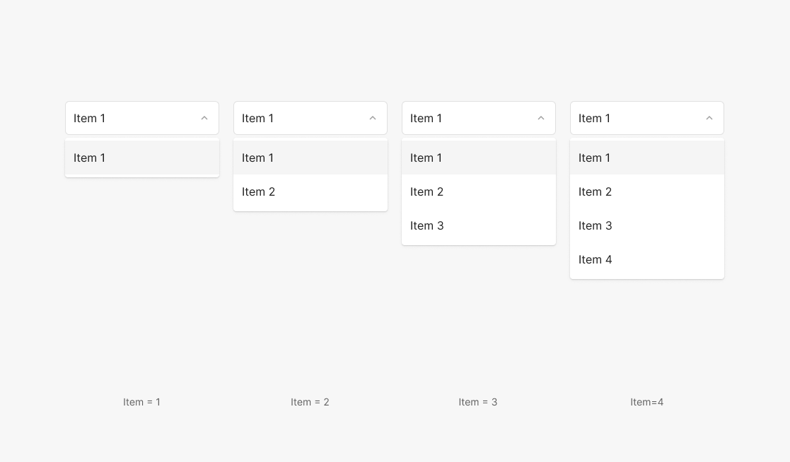 Item의 갯수가 4개보다 같거나 적을 경우에 Dropdown의 표출되는 Menu의 Height는 Item의 Height의 총합에 4*2px (Menu의 상하 Padding)을 더한 값으로 Flexible하게 갯수마다 다르게 맞춰 변형 되는 것이 특징입니다. Dropdown Menu의 Item이 1개가 되는 것은 지양합니다.