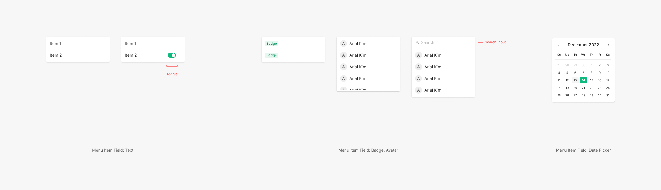 Dropdown Item의 Field를 구성하는 Components는 다양하게 사용이 되며 주요 요소는 Text, Avatar, Badge가 있으며 부가적으로 함께 사용되는 요소에는 Toggle, Icon이 있습니다. 이외에도 Dropdown Button의 높이와 동일한 Search Input이 사용됩니다.