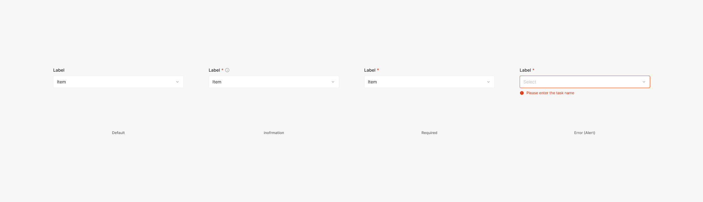 Dropdown이 포함된 입력 Form의 형태에서 Dropdown 항목에 대한 Label이 함께 사용됩니다. Subtitle 3 (Inter, Medium, 14px)가 함께 사용 되며 해당 Required, Error, 그리고 부가적인 정보가 필요한 Information의 형태로 사용 가능 합니다.