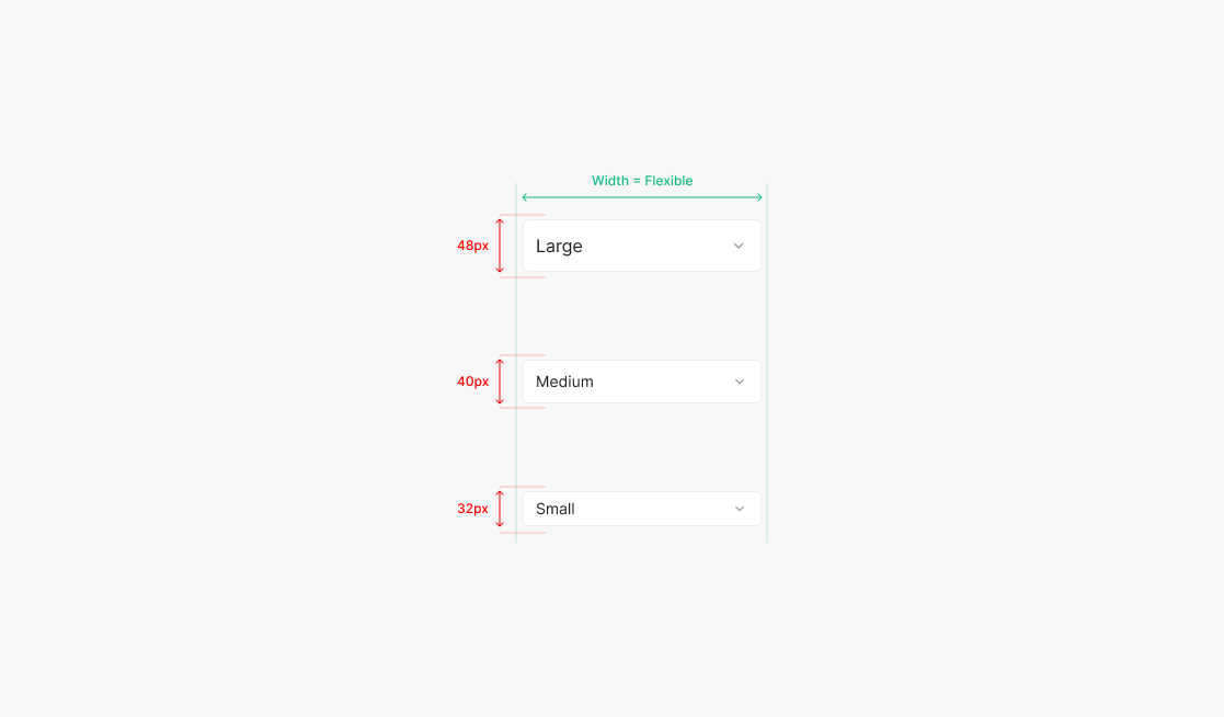 Medium 사이즈 Dropdown에는 Subtitle 3 (Inter, Medium, 14px)를 사용하고, Large 사이즈 Dropdown에는 Subtitle 1 (Inter, Medium, 16px)를 적용합니다. 이 규칙은 Label과 Input Field 사이의 시각적 위계를 명확하게 만들고, 서로 다른 크기의 Form 요소가 함께 배치되더라도 일관된 리듬을 유지하도록 돕습니다.