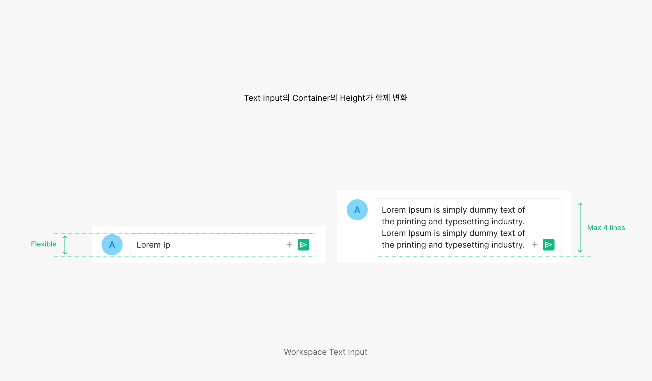 짧은 코멘트나 빠른 응답 입력에 사용됩니다. 입력 필드의 높이는 고정되며, 제한된 영역 안에서 간결하고 효율적인 입력 경험을 제공하는 것이 특징입니다.