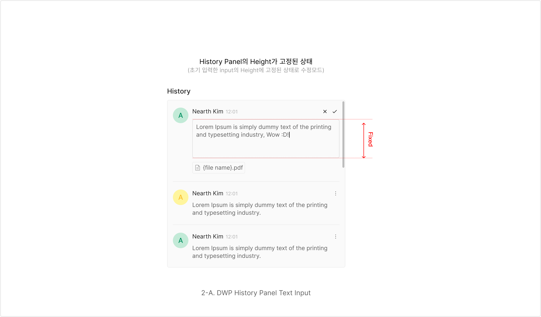 사용자가 설명이나 상세 내용을 직접 입력하는 경우에 사용됩니다. 특히 History Panel과 같이 높이가 고정된 영역에서는 전체 패널 구조를 유지한 상태에서 입력이 이루어지도록 설계되는 것이 특징입니다.