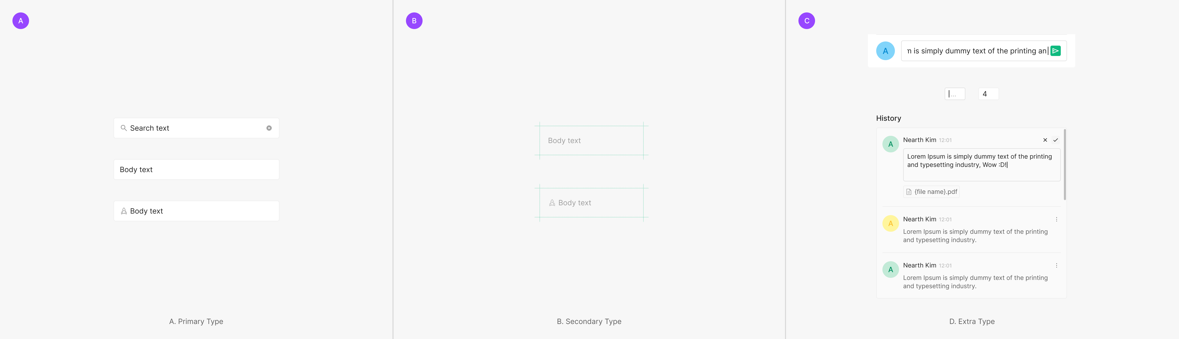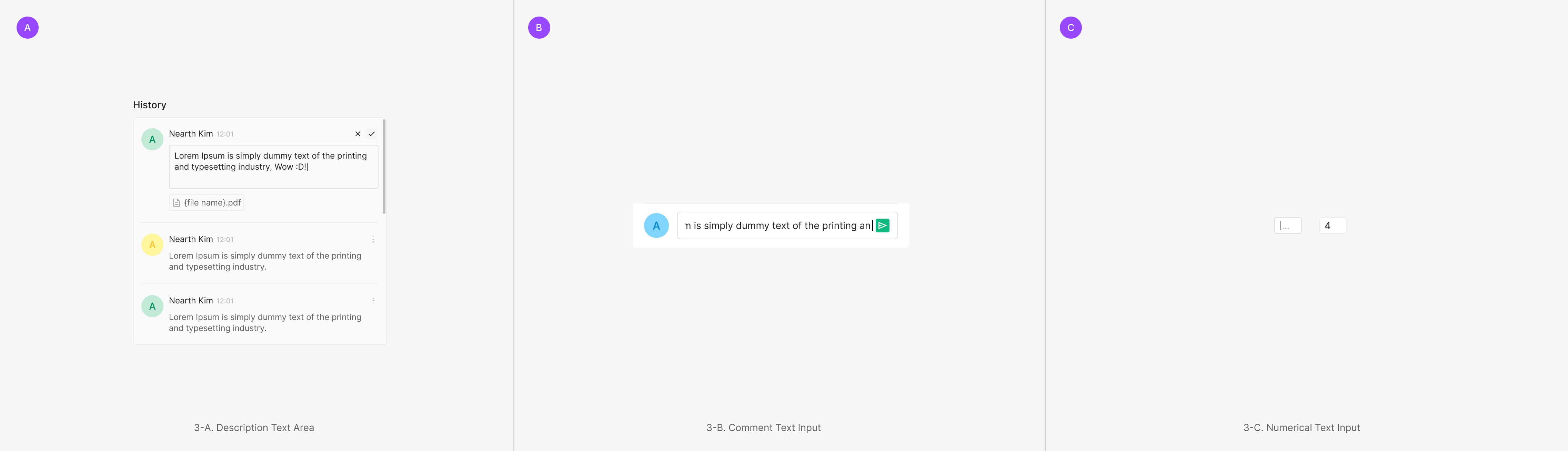 Extra Type은 Primary와 Secondary 내에 포함되지 않는 타입으로, 최대 Height를 기준으로 작성되는 Input에 따라 Height가 유동적인 Description Text Area와 Height를 고정한 상태로 사용되는 Comment Text Input, 그리고 Numerical Data 입력시에만 사용되는 Numerical Text Input이 있습니다.