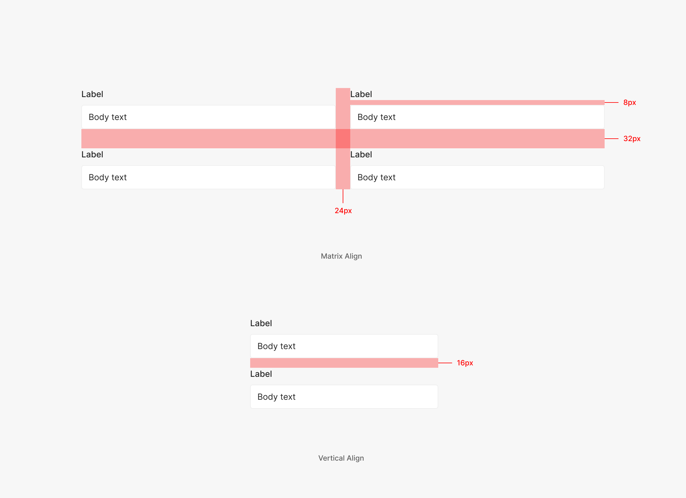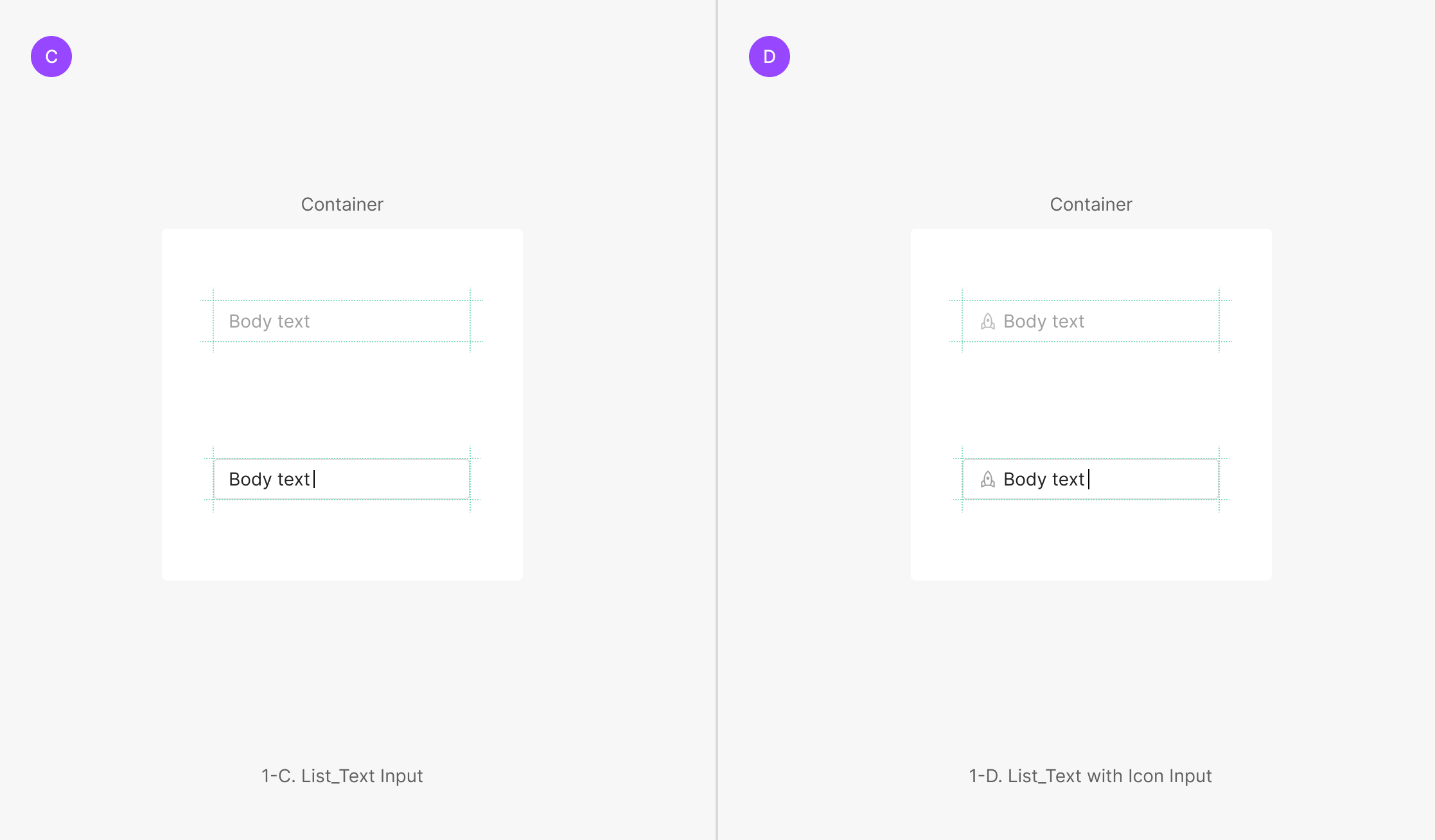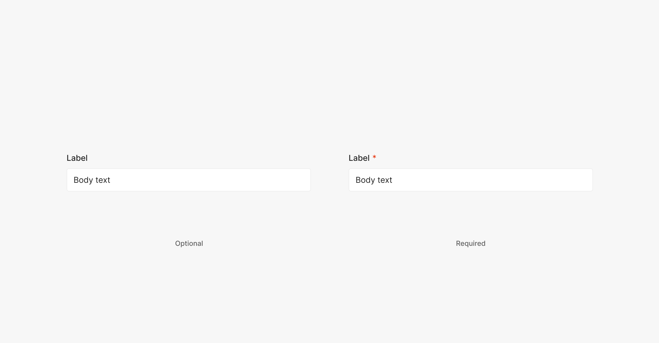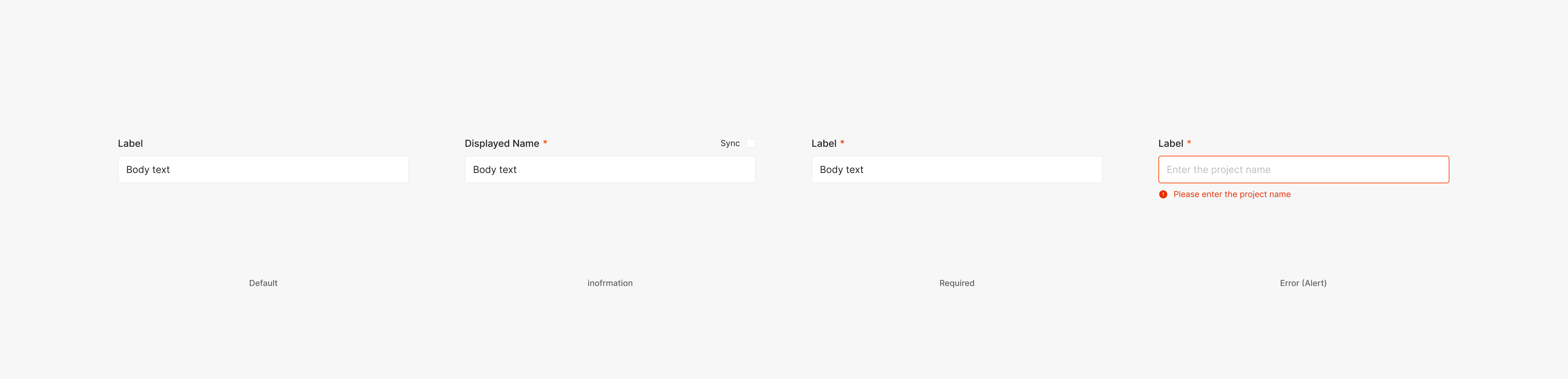 해당 입력 값이 필수 값인 경우를 표기하기 위해서 사용 됩니다. Label과 4px 간격을 두고 표기하는 것이 특징이며 필수 값에는 '*'을 표기하고, 필수가 아닌 선택값일 경우에는 별도의 표기 없이 Label만 사용하는 것이 특징입니다. '*'의 값은 Body 2(Inter, Regular, 14px)를 사용하며 Text의 사이즈는 보통 Label의 값과 동일하게 가져가는 것이 특징입니다.