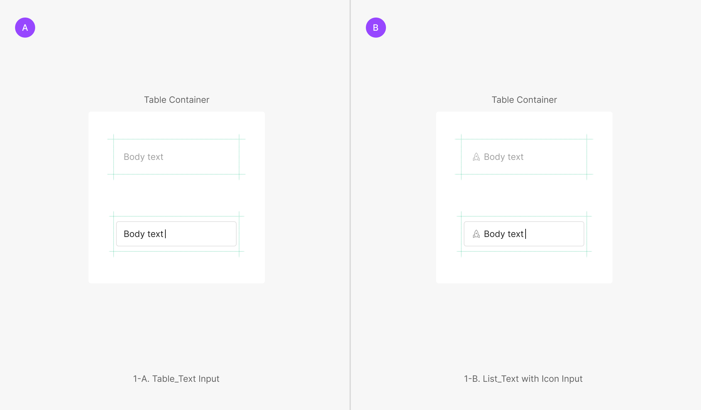 Secondary Type은 Input의 Outline이 표출이 되지 않는 상태로 Focused 상태가 되었을때 Primary Type의 Text (with Icon) Input 형태가 사용되는 타입입니다. Table Input과 List Input으로 2가지로 분류하여 사용됩니다. Table Dropdown의 경우 해당 영역의 일정 부분 Padding이 제공된 상태에서 Input 영역을 제공하는 것이 특징이며, List Input의 경우 List 한 Cell의 영역을 모두 차지하여 (Padding=0) 사용하는 것이 특징입니다.