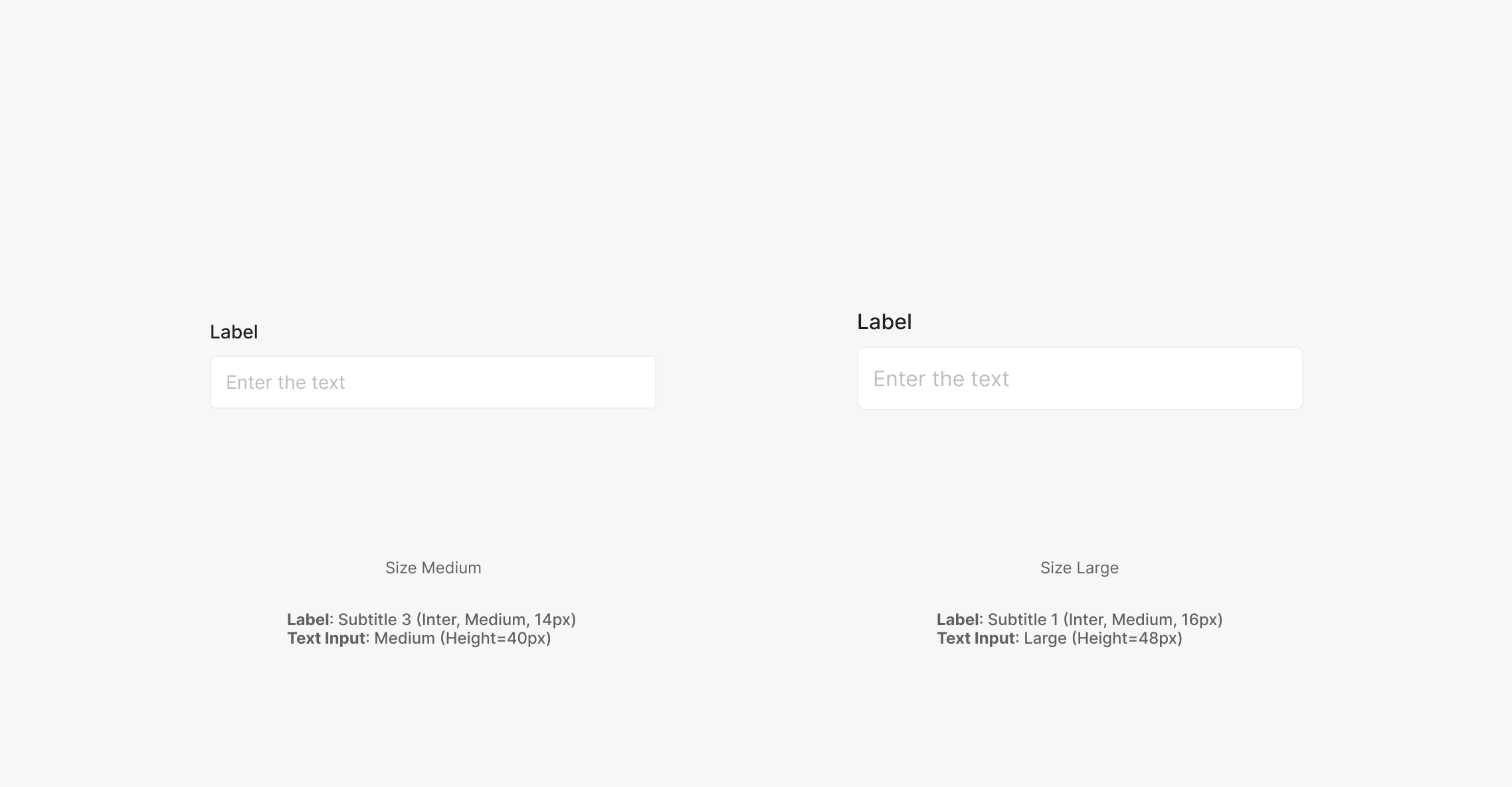 Form에 사용되는 Label이 포함된 Input의 경우 Large Size와 Medium Size의 Primary Type의 Text Input이 사용 되어 집니다. 각 사이즈별 Label의 Typography를 다르게 사용하는 것이 특징입니다.