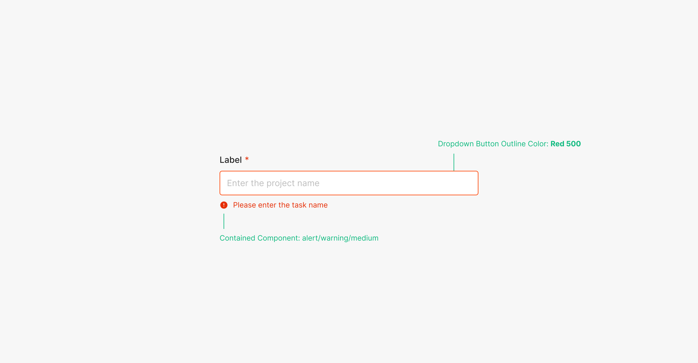 해당 입력 값에 대한 에러(alert)을 띄우는 경우로, 입력값에 대한 필수 요건에 대한 설명을 표출해 주는 것이 특징입니다. 별도의 Action (e.g. Confrim Button)후에 표출되는 것이 특징이며 Dropdown Button의 Outline의 색상과 함께 Text Alert을 함께 표출 해주는 것이 특징입니다. Error 상태의 Dropdown Button Outlined Color: Red500을 사용하며, Medium 사이즈의 Alert를 사용합니다.