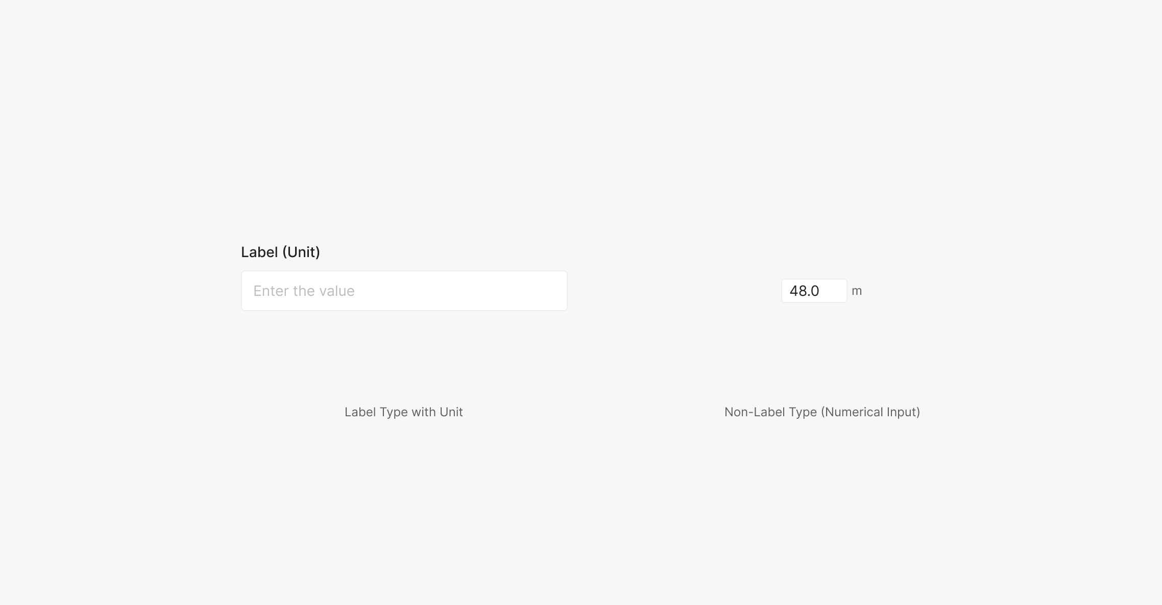 Input의 들어가는 값이 Value일 경우, 해당 값의 단위 정보를 Label에 표출하는 것을 원칙으로 합니다. 표출시 Label (Unit)의 방식으로 괄호를 이용하여 표기 하는 것이 특징입니다. Numerical Input의 경우 별도의 Label이 함께 사용되는 경우가 없기 때문에 해당 Input에 단위 표기가 필요한 경우 우측 바깥쪽에 4px의 간격을 두고 위치 시키는 것이 특징입니다.