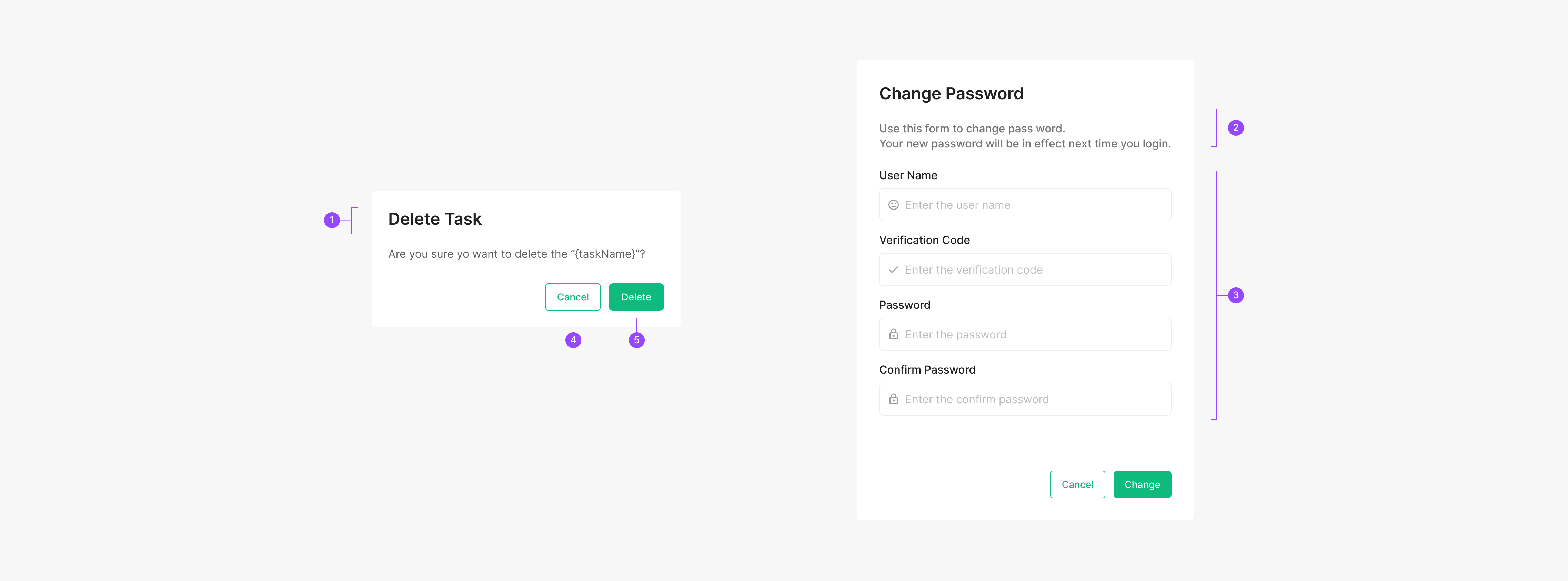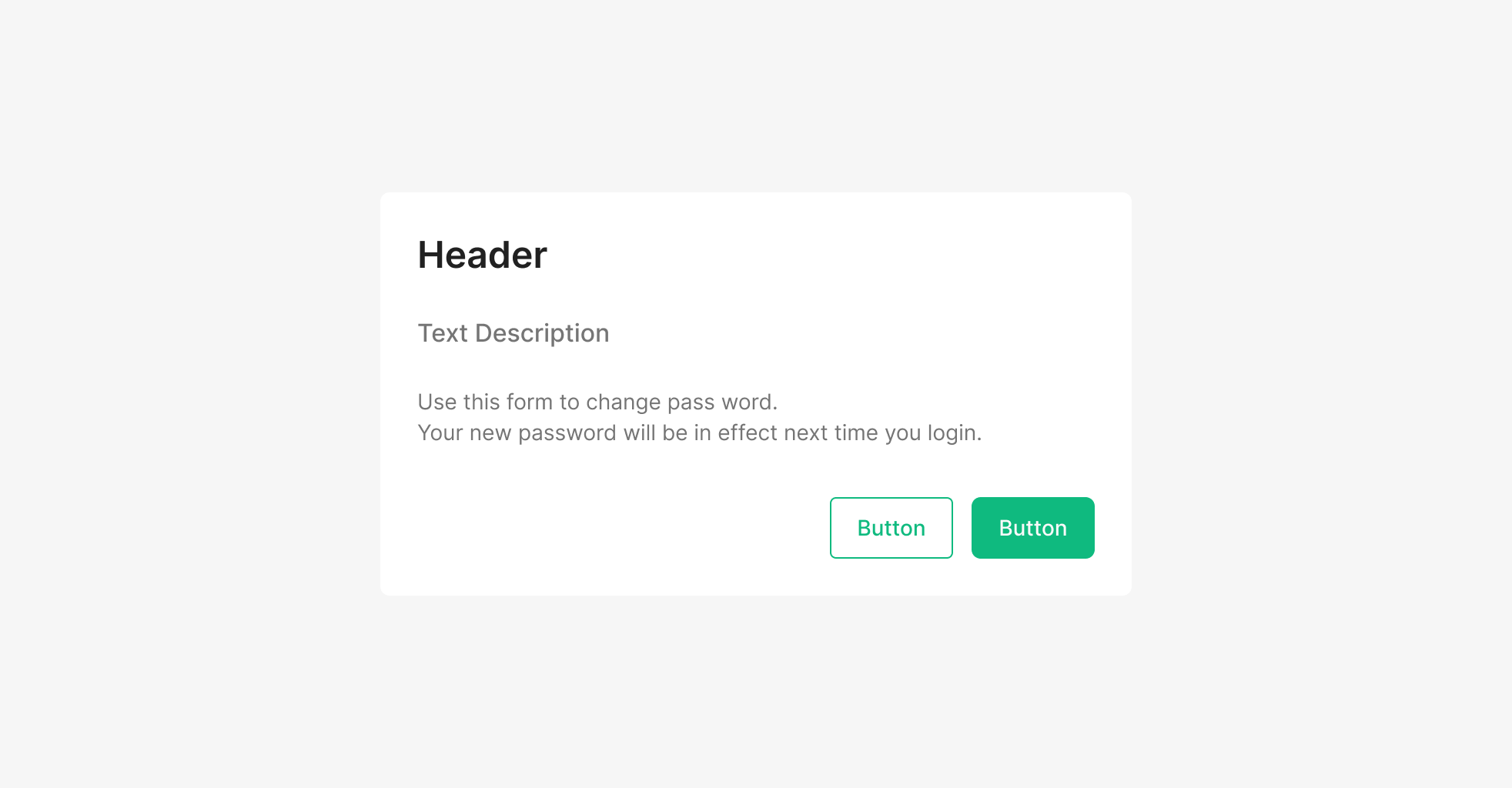 Button 버튼은 최소 1개에서 최대 3개까지 사용 가능하며 기본적으로 2개를 사용하는 것을 권장합니다. 우선순위가 높은 버튼은 Text 컬러 Green-500을 적용하여 가장 위치 해야 합니다. 이전으로 돌아갈 수 있는 버튼을 반드시 포함해야 합니다.