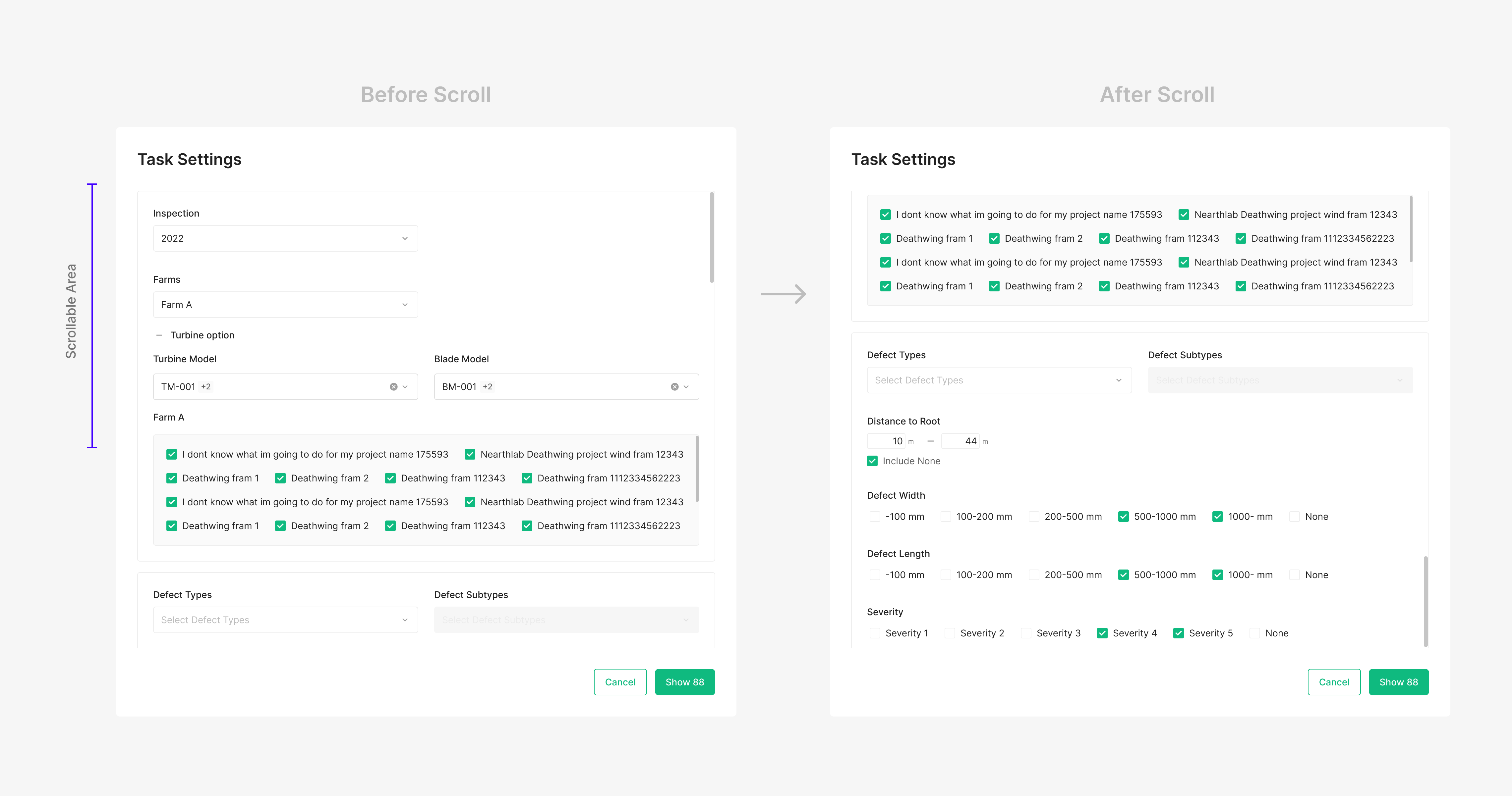 콘텐츠가 최대 높이 또는 설정된 높이를 초과하는 경우에는 본문 영역만 스크롤되며, 버튼 영역은 고정된 상태를 유지합니다. 이를 통해 사용자는 긴 콘텐츠를 확인하는 중에도 주요 액션에 지속적으로 접근할 수 있습니다.