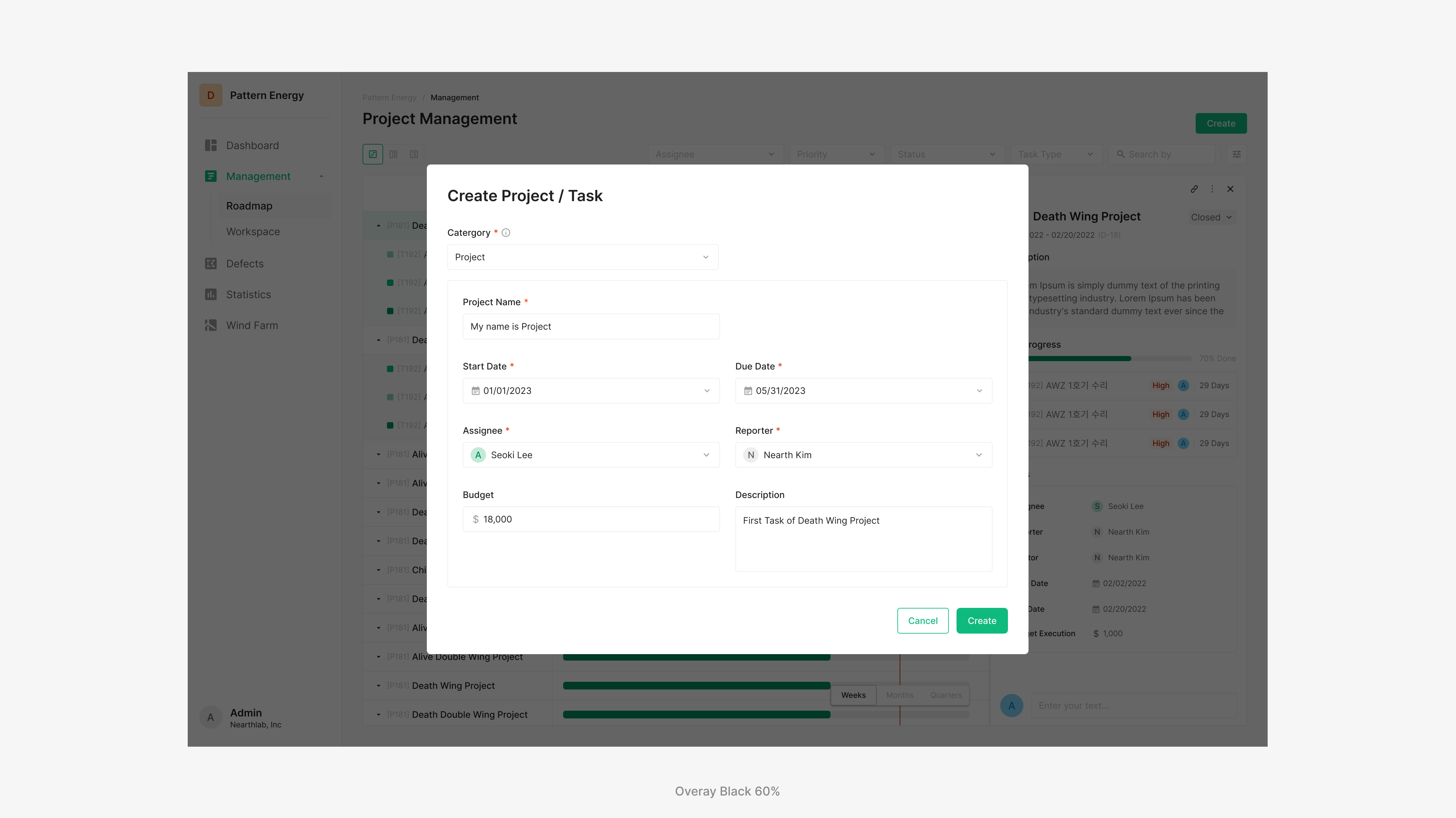 Dimmed는 배경과 Moadal를 구분시키는 투명한 표면 요소입니다. 화면의 나머지 부분에 접근 할 수 없음을 표현하고 주의를 집중시키기 위해 Modal 뒤에 Dimmed를 사용합니다. Overlay는 컬러 Black, Opacity 60%를 사용합니다. Dim Area를 선택 혹은 클릭하더라도 기존 화면으로의 이동이 불가능 합니다. 기존 화면으로의 이동을 원할시 Cancel 버튼 사용을 권장합니다.