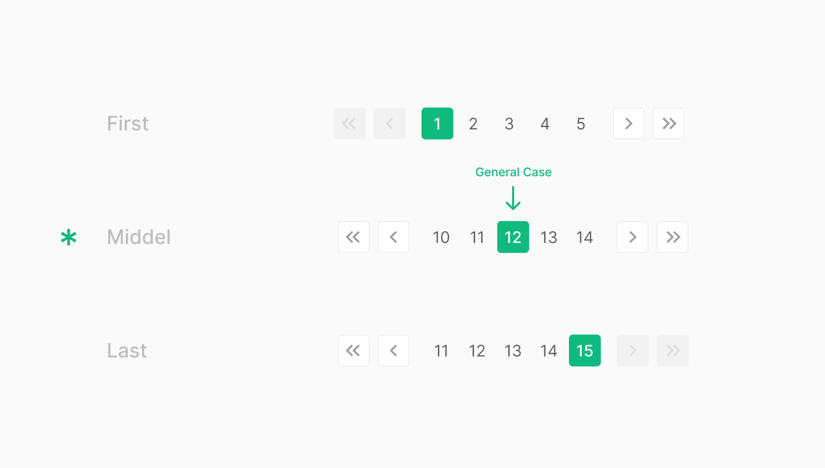 일반적으로 Pagenation Item의 현재 선택된 상태의 위치는 가운데 위치하며, 가장 앞쪽의 1,2 그리고 마지막 페이지의 2 페이지의 경우 끝점을 기준으로 순차적으로 위치하는 것이 특징입니다.