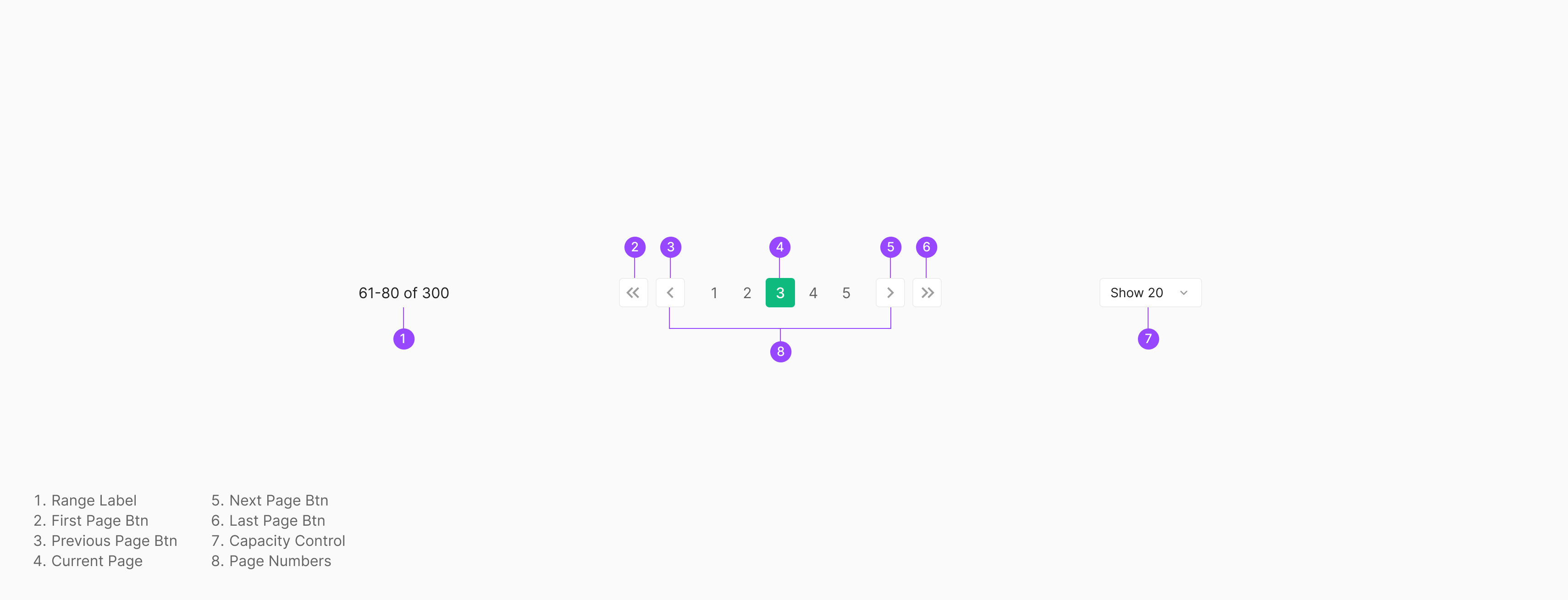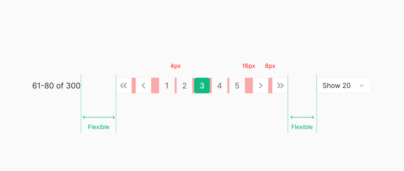Previous/Next, First/Lat Page Button 간격을 8px을 띄우며 좌우 페이지 버튼과는 16px을 띄우는거로 합니다. 또한 각 페이지 버튼 별 간격은 4px의 마진값을 가집니다. 양쪽 좌우에 위치한 Range Label과 Capacity Control과의 간격은 Pagenation이 위치하는 Container의 값에 따라 Flexible 하게 사용되어지는 것이 특징입니다.