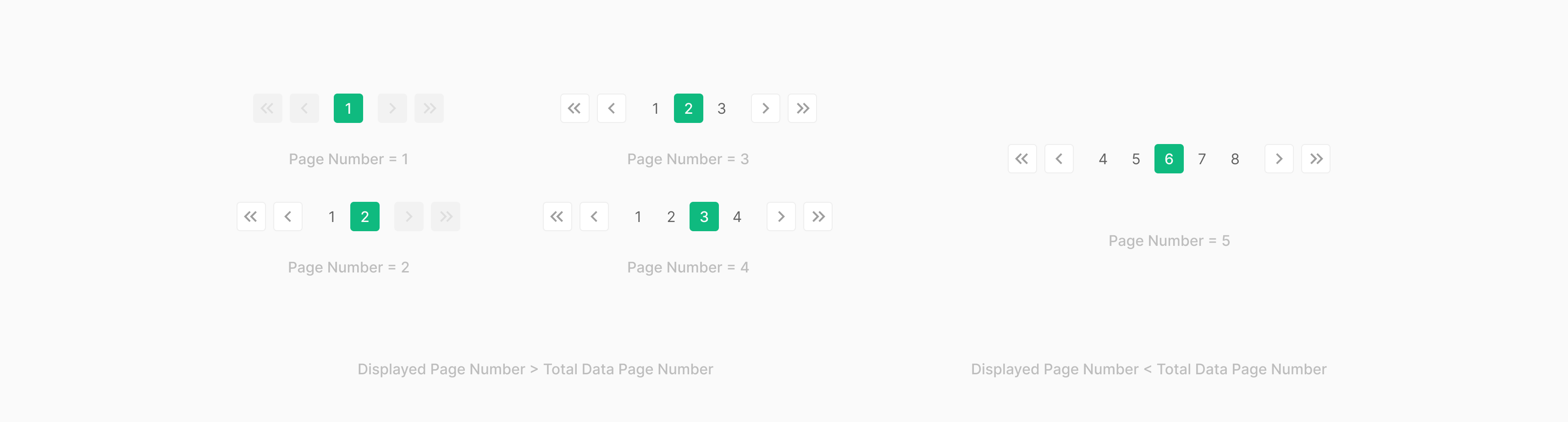 디스플레이 화면 별 Page Number 의 개수는 기본적으로 5개로 구성되어지며, 해당 갯수를 최댓값으로 넘지 않는 것으로 합니다. 전체 데이터의 페이지 넘버 < 5일 경우 전체 페이지 넘버의 갯수를 표출되는 페이지 갯수(1-4개)로 사용하는 것이 특징입니다.