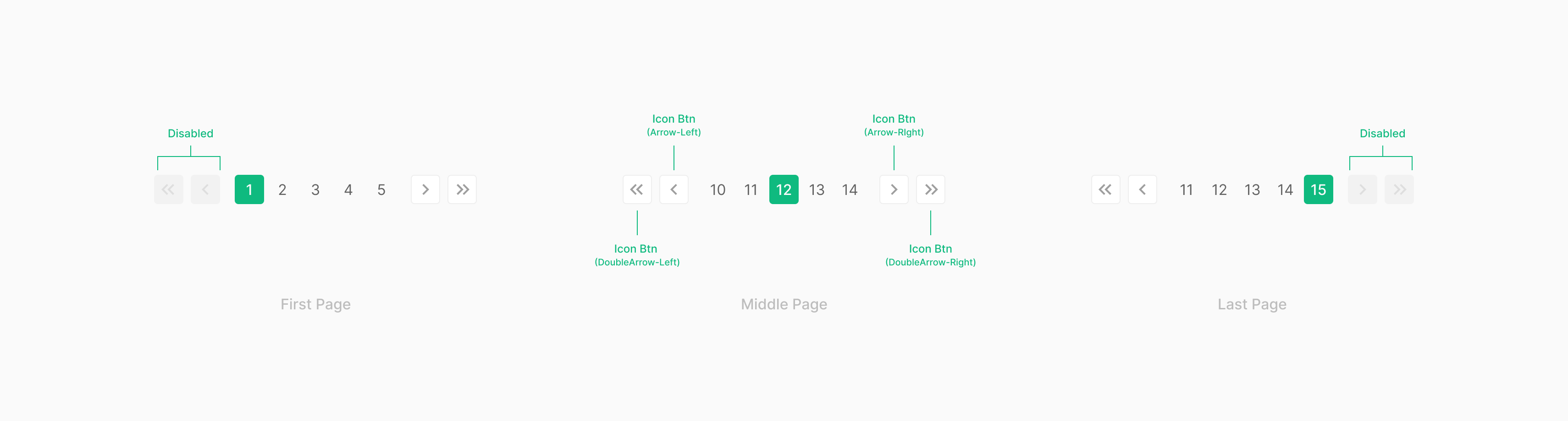 Previous/Next, First/Last Page Icon Button은 페이지당 클릭 한번으로만 이루어집니다. Medium Size의 Icon Button이 사용되어 집니다. 또한 가장 첫번째 페이지 혹은 가장 마지막 페이지의 경우와 같이 페이지 이동이 불가능한 경우에 버튼의 상태는 Disabled가 되는것으로 합니다.