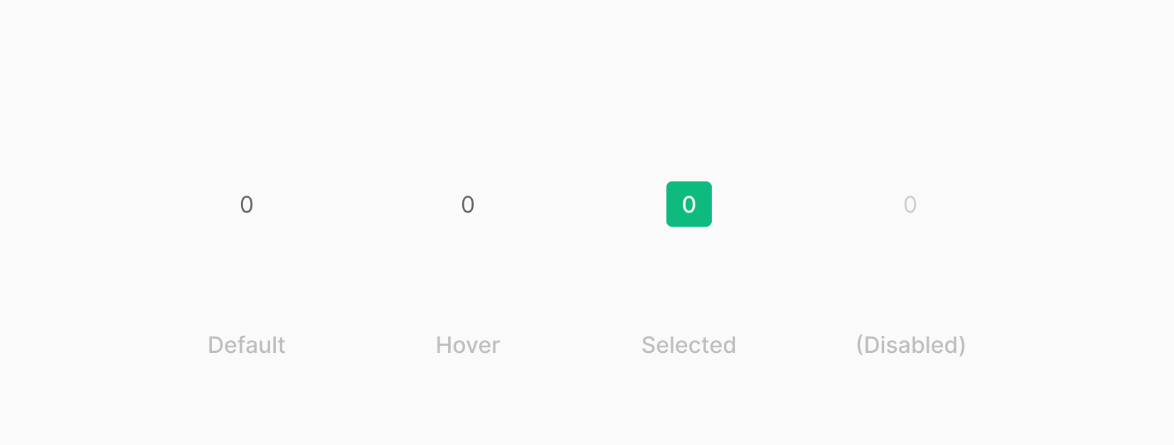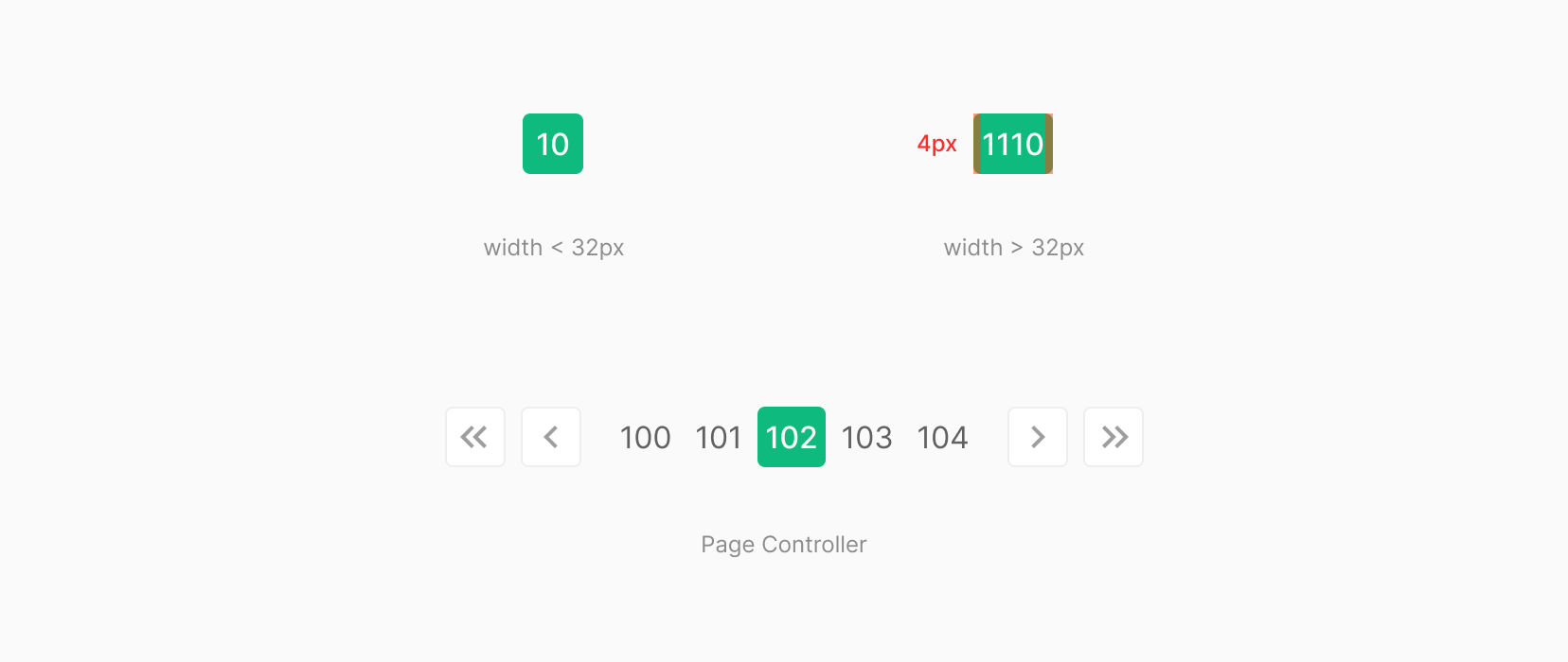좌우 4px의 padding을 기준으로 page number가 적용 될 시 32px보다 적을 경우 32px로 width 값을 고정하여 사용됩니다. 해당 page number의 값을 적용 하였을때 width 값이 32px 보다 커지는 경우에는 좌우 4px의 padding을 기준으로 늘어나는 것으로 하며, 3자리 수 이상의 조합의 경우 page number 부분의 조합의 너비의 차이가 발생 합니다.