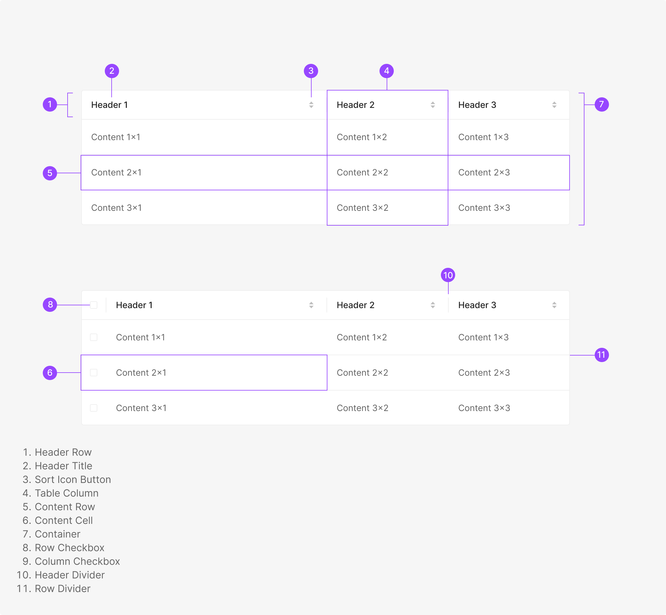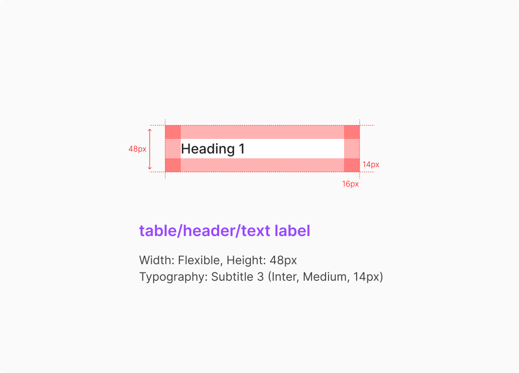 Table Header는 각 Column의 의미를 명확하게 전달하고, 필요에 따라 선택 및 정렬과 같은 보조 기능을 함께 제공하기 위해 사용됩니다. 기본적으로 Text Label Type을 기준으로 구성되며, 테이블의 목적과 인터랙션 수준에 따라 Filter 또는 Selection 요소를 포함한 형태로 확장할 수 있습니다.