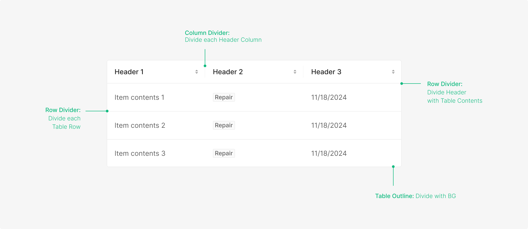 Table에 사용되는 Border는 Background와 구분을 목적으로 하는 Outline, 각 Row를 구분을 위한 목적의 Horizontal Line, 그리고 Header Row내의 Header를 분리하기 위한 목적의 Vertical Line으로 총 3가지의 분류로 사용 됩니다.