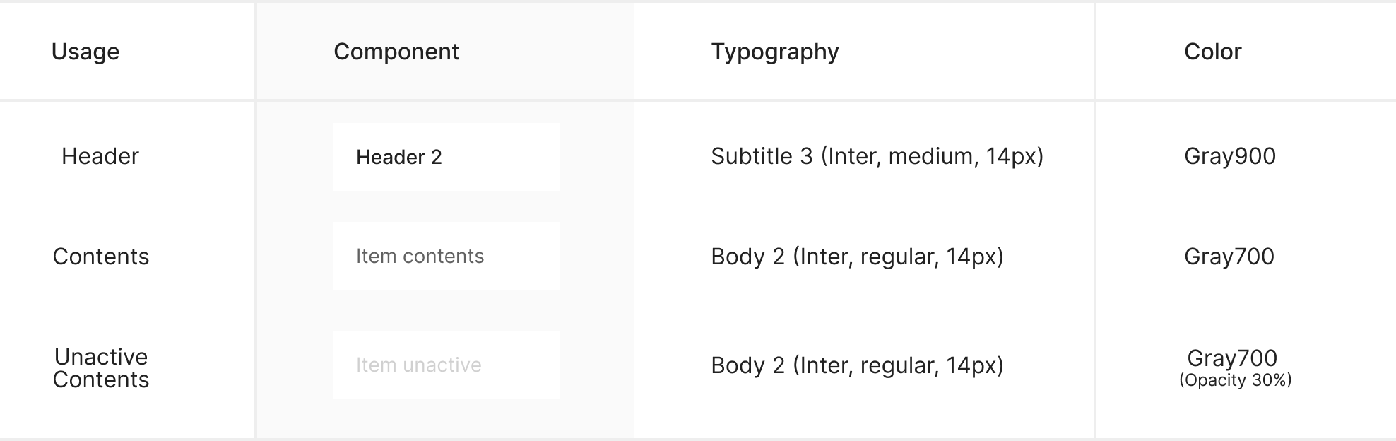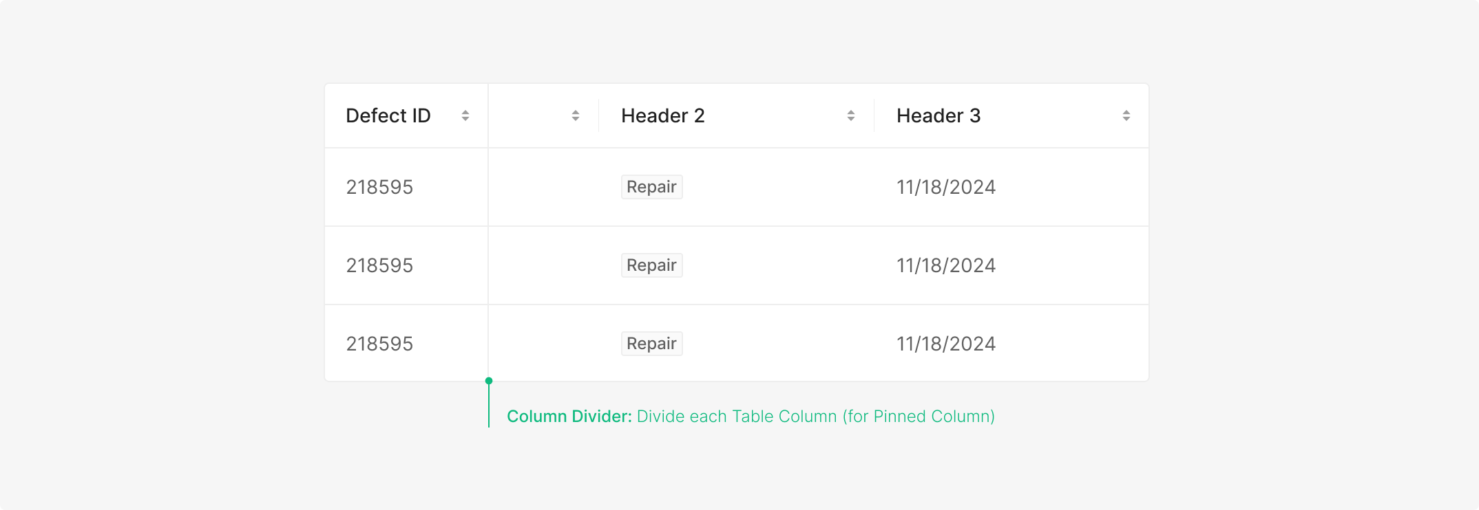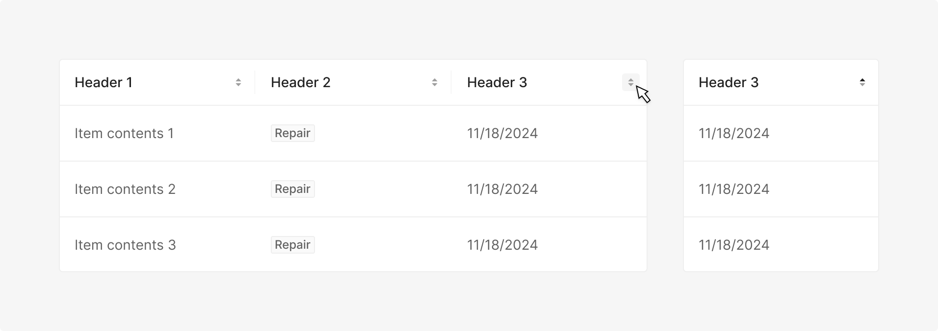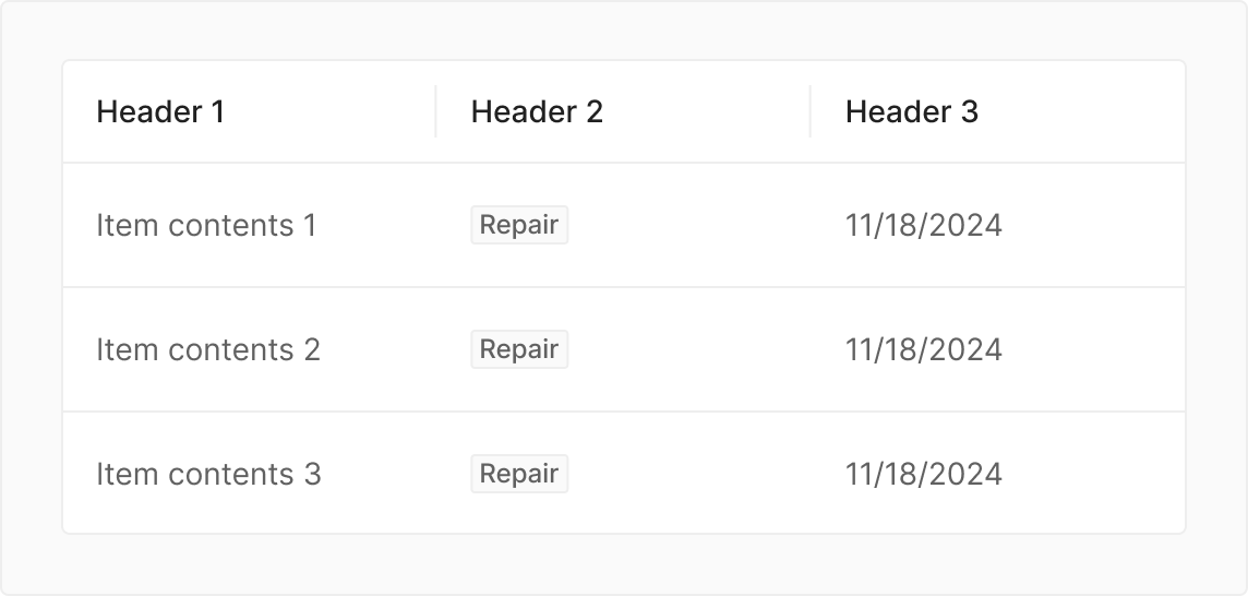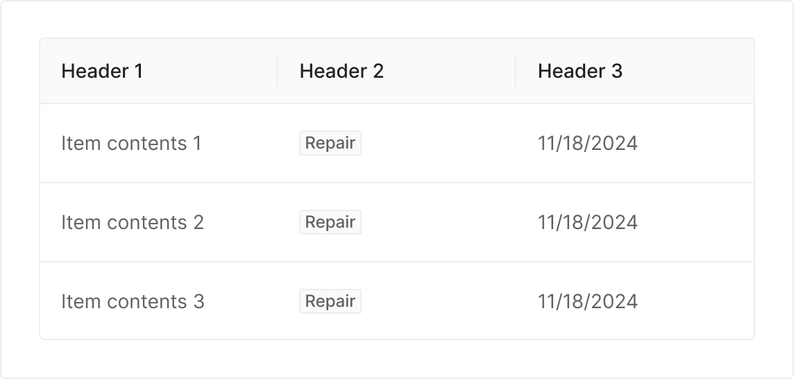 가장 기본적인 Header 형태로, Column의 이름이나 데이터 속성을 텍스트 중심으로 명확하게 전달할 때 사용합니다. 정렬이나 선택과 같은 추가 인터랙션이 필요하지 않은 읽기 중심의 Table에 적합합니다.