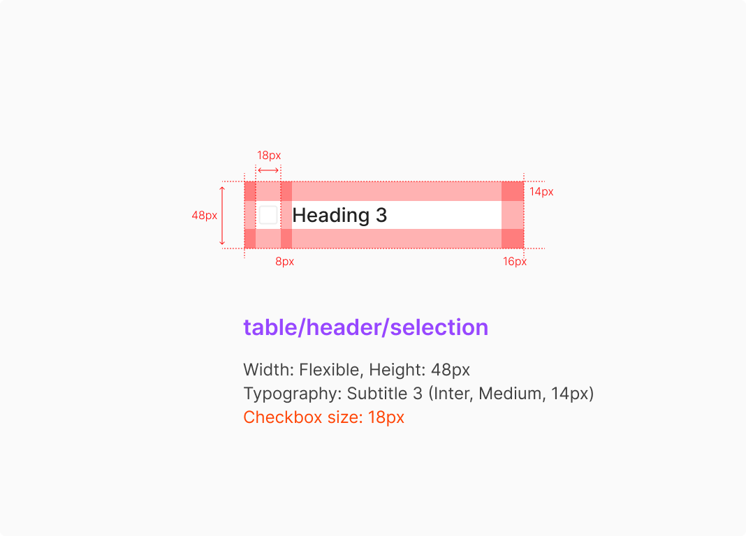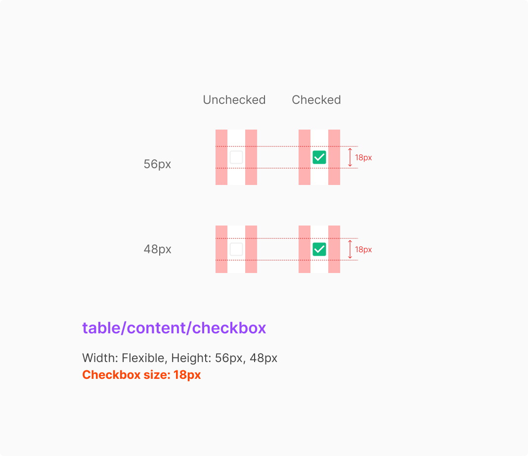 Checkbox가 포함된 Type의 Width의 경우, 좌우 Padding을 12px로 둔 값으로 정의 합니다. Checkbox Type은 일반적으로 Table Row의 가장 좌측에 위치하는 것을 원칙으로 합니다.