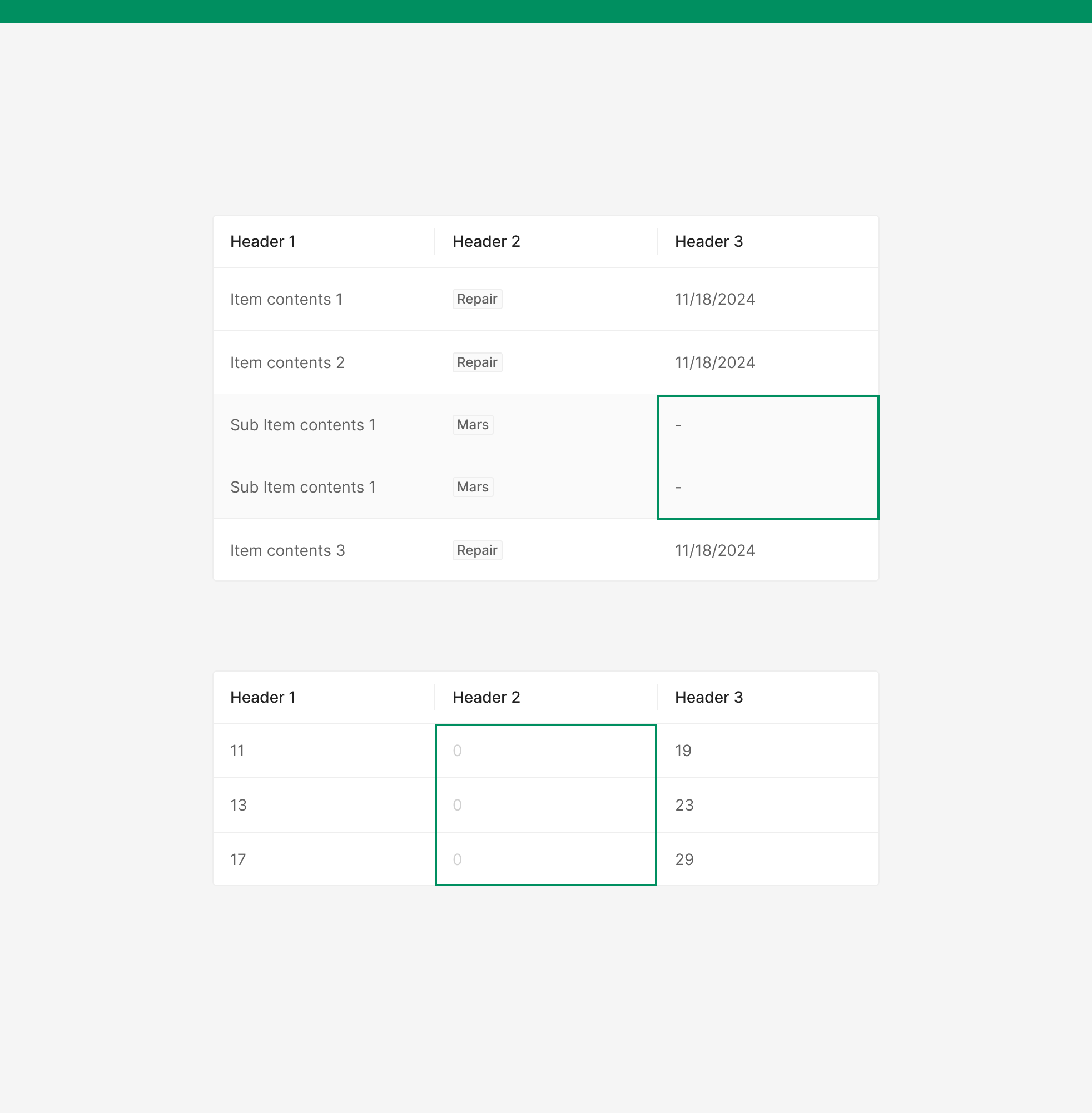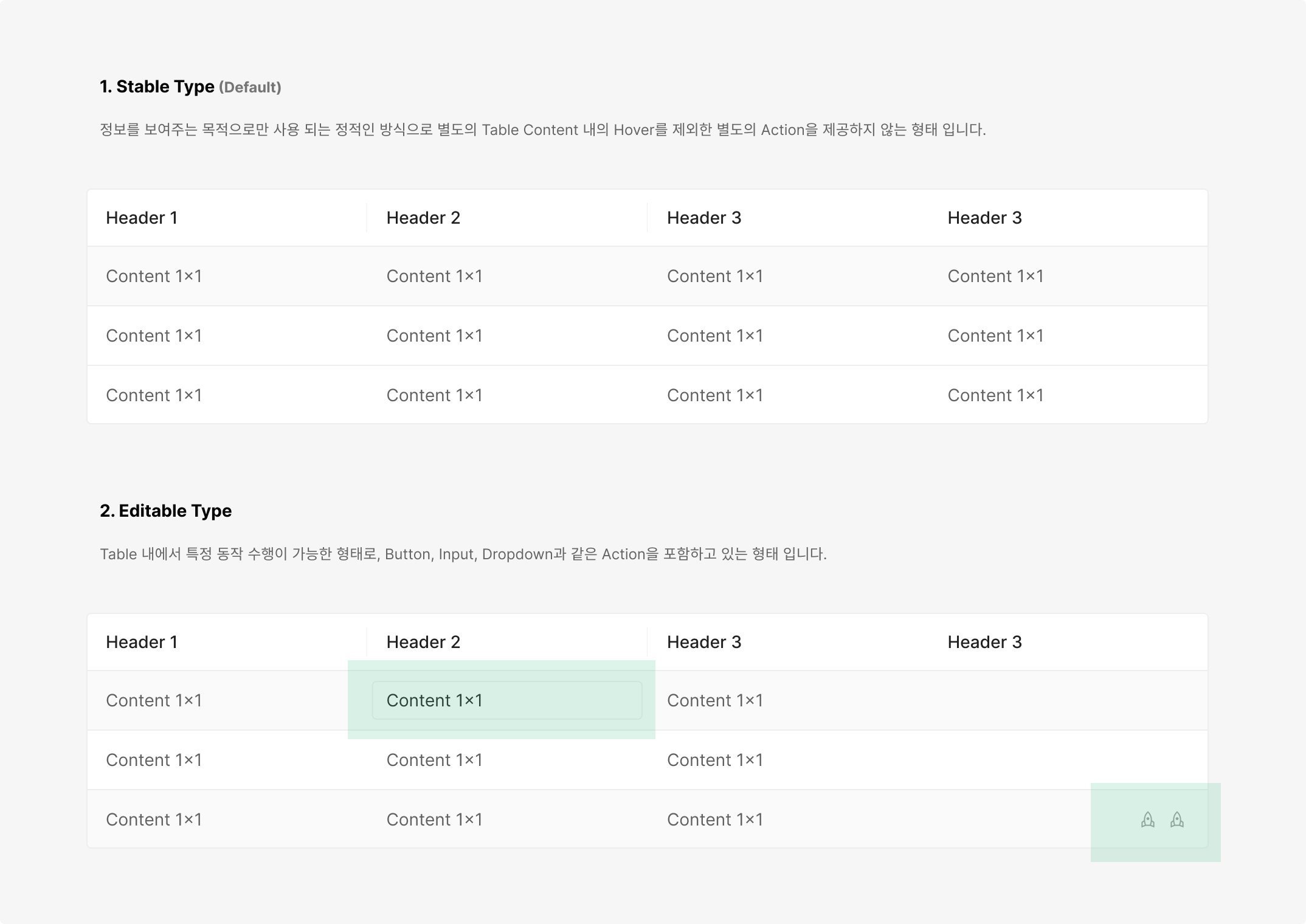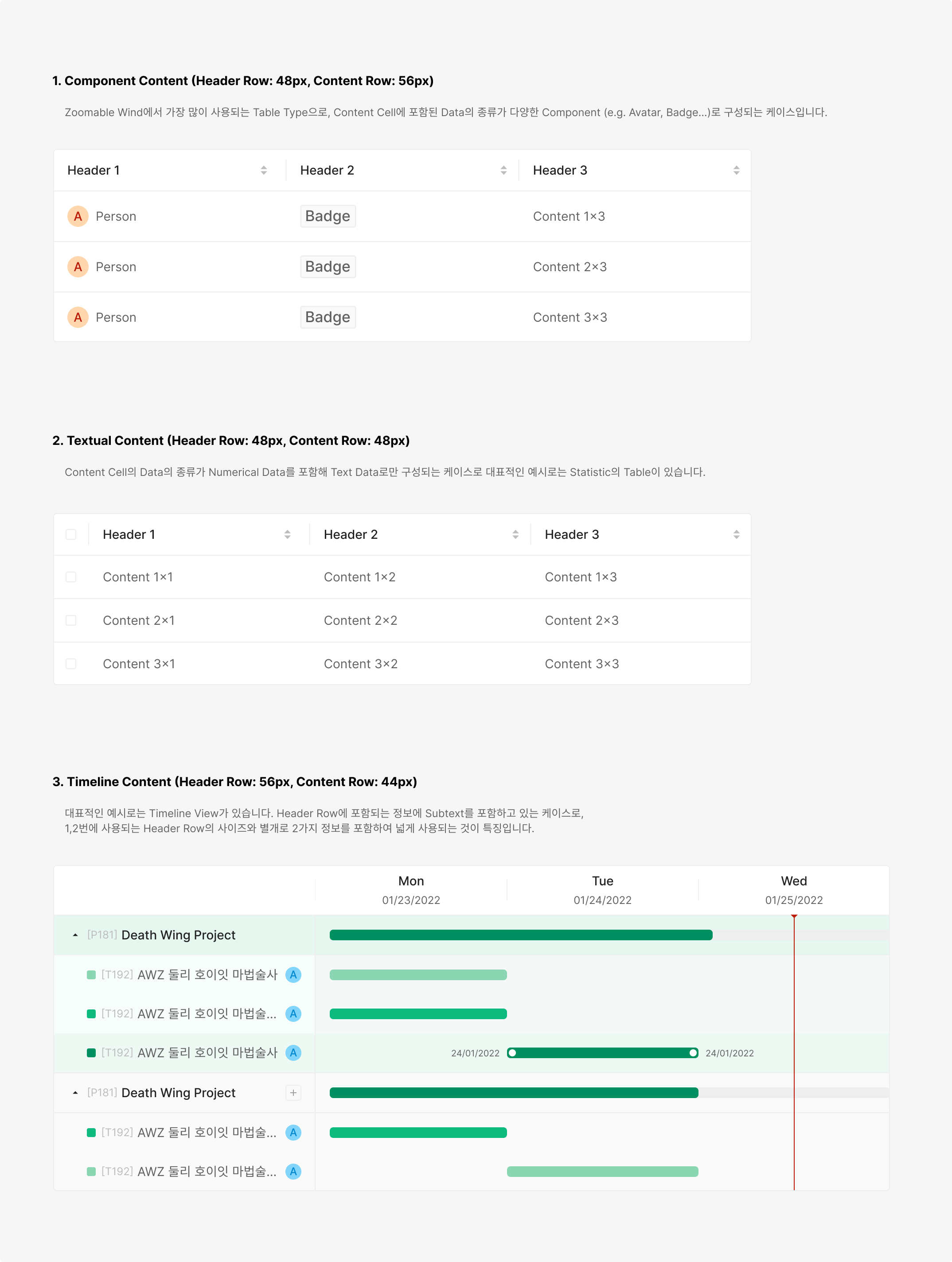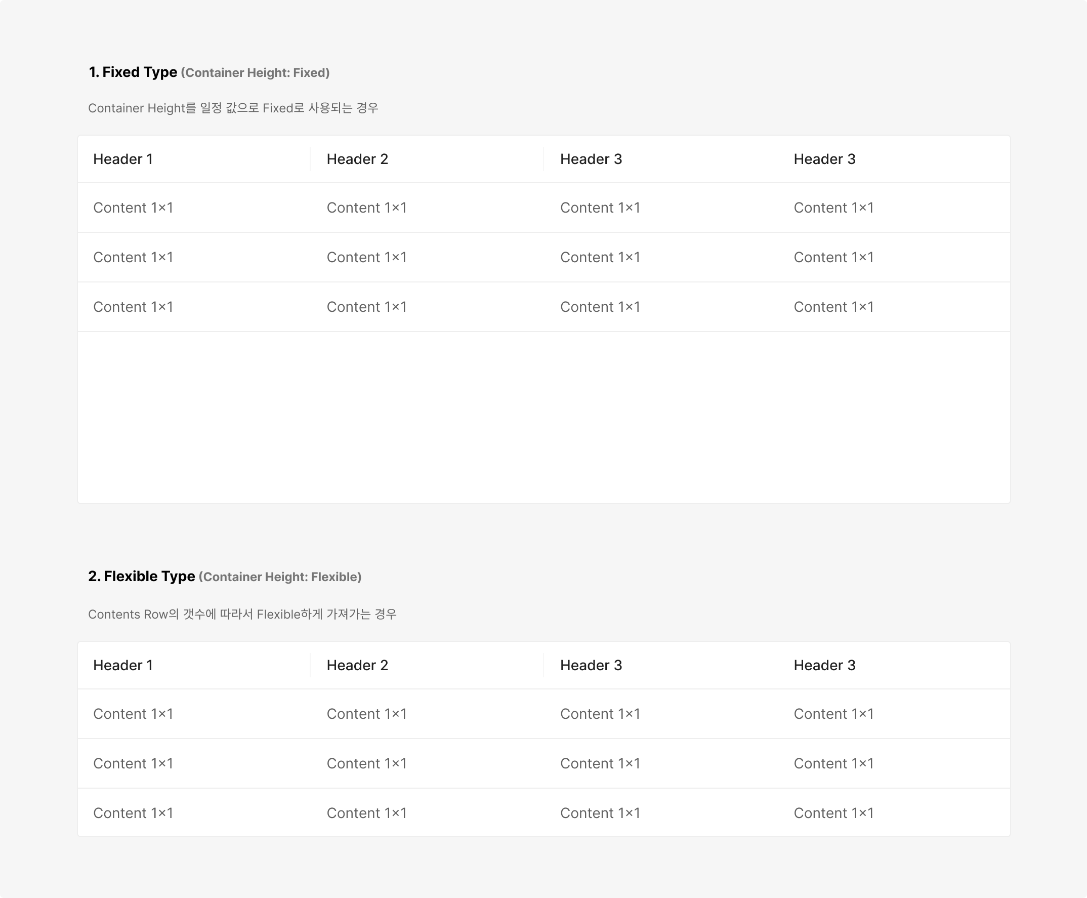 사이즈 Separation 타입의 경우 다양한 타입의 Header를 제한하여 사용하며, 2개를 넘지않는 것이 좋습니다. 같은 타입의 Header의 경우 이해를 위한 시각적으로 분리되어 보이지 않도록 단일한 Header Style로 사용해 주는 것을 지향합니다.