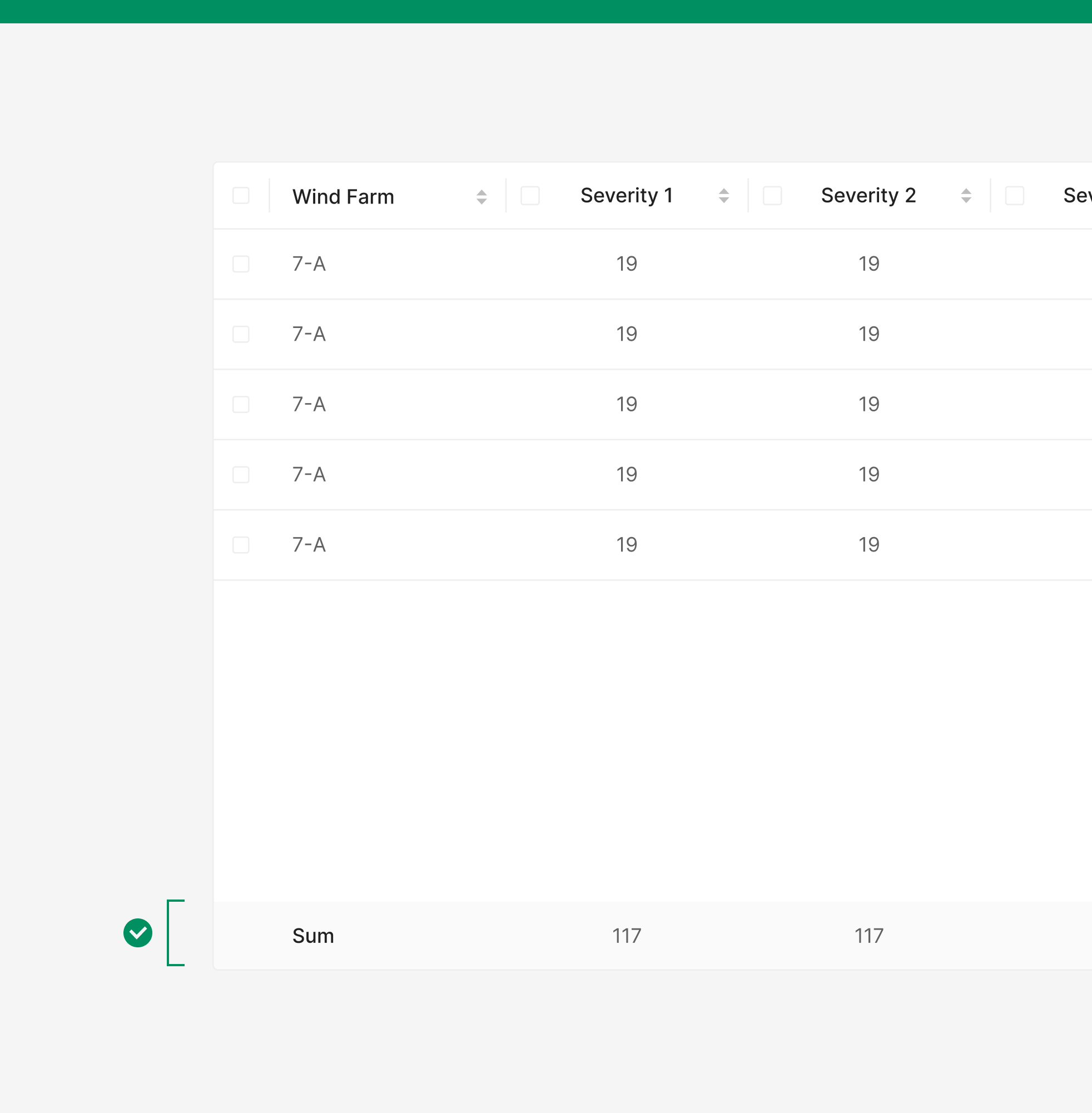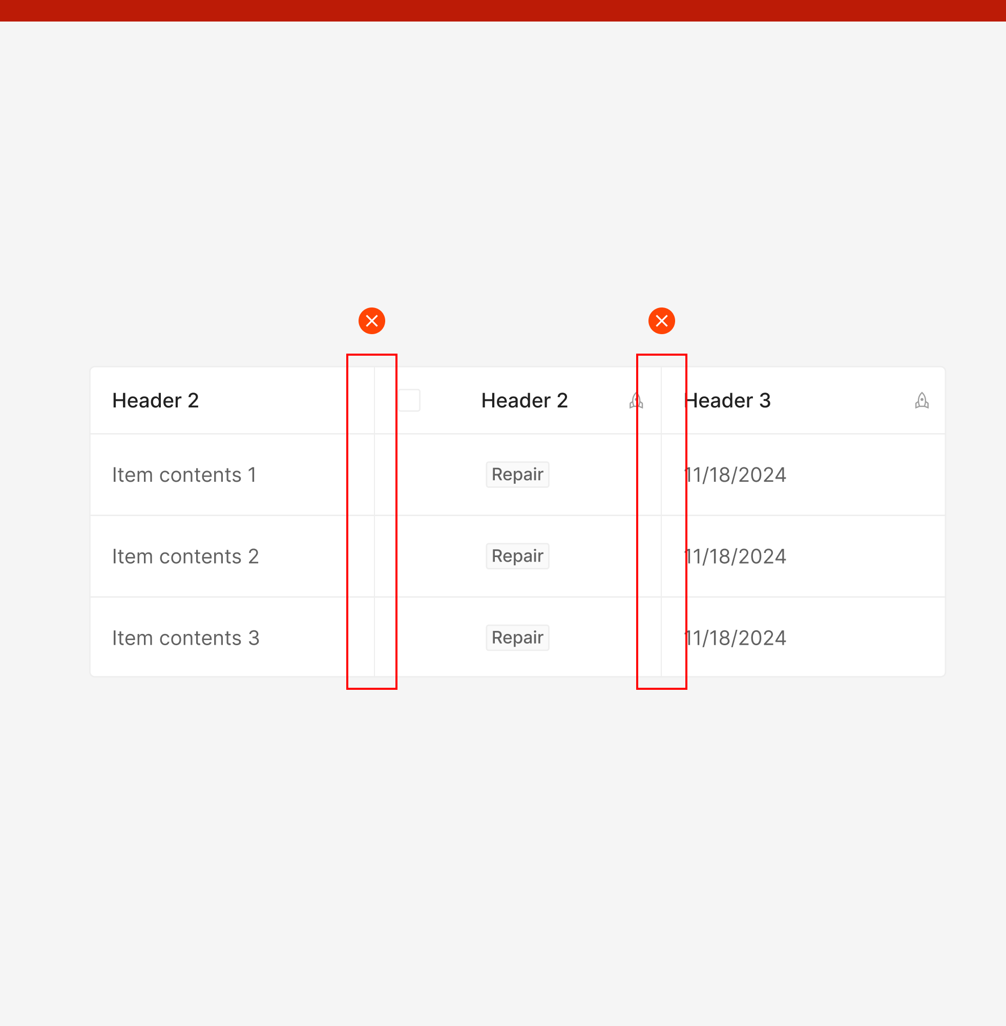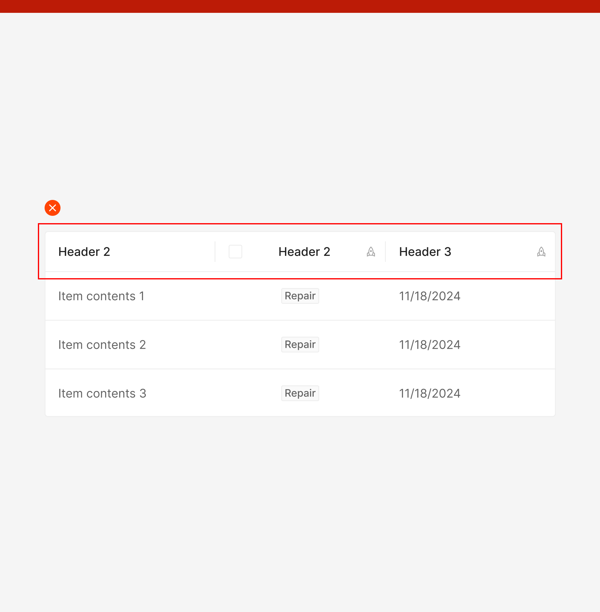 Header에 Selection Control만 포함된 형태로, Row 선택 기능을 제공하기 위해 사용됩니다. 주로 체크박스를 통한 다중 선택 테이블에서 전체 선택 상태를 제어하는 용도로 사용됩니다.