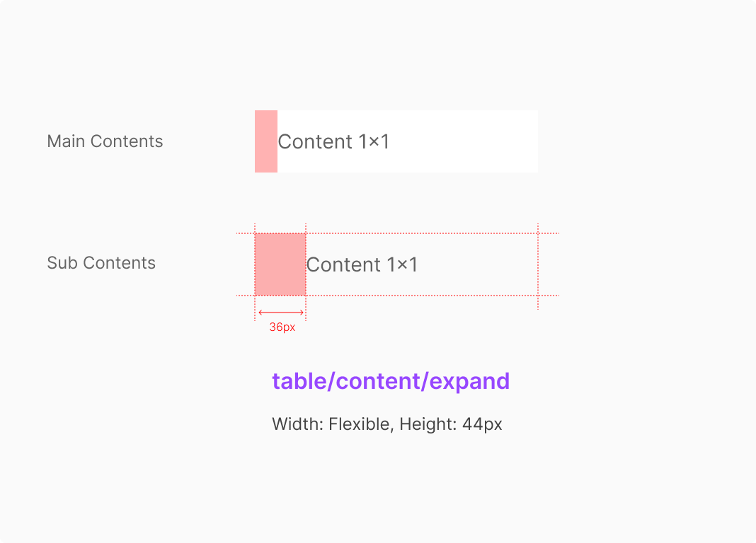 Table Cell내의 Contents의 Padding은 기본적으로 좌우 16px을 기본으로 Editable State인 상태에서는 Dropdown 혹은 Input의 Container를 기준으로 좌우 4px를 가져가는 것으로 합니다.