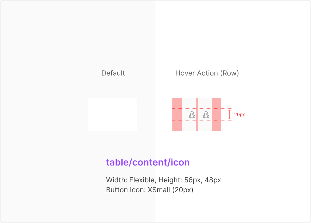 Table Cell 내의 Button Icon의 경우, Table Row 우측 끝에 위치하는 것으로 합니다. Height=56px 및 48px인 경우에 모두 사용이 가능 하며 Width의 최소 값은 Button Icon Group의 좌우 Padding 16px인 경우로 정의 합니다.