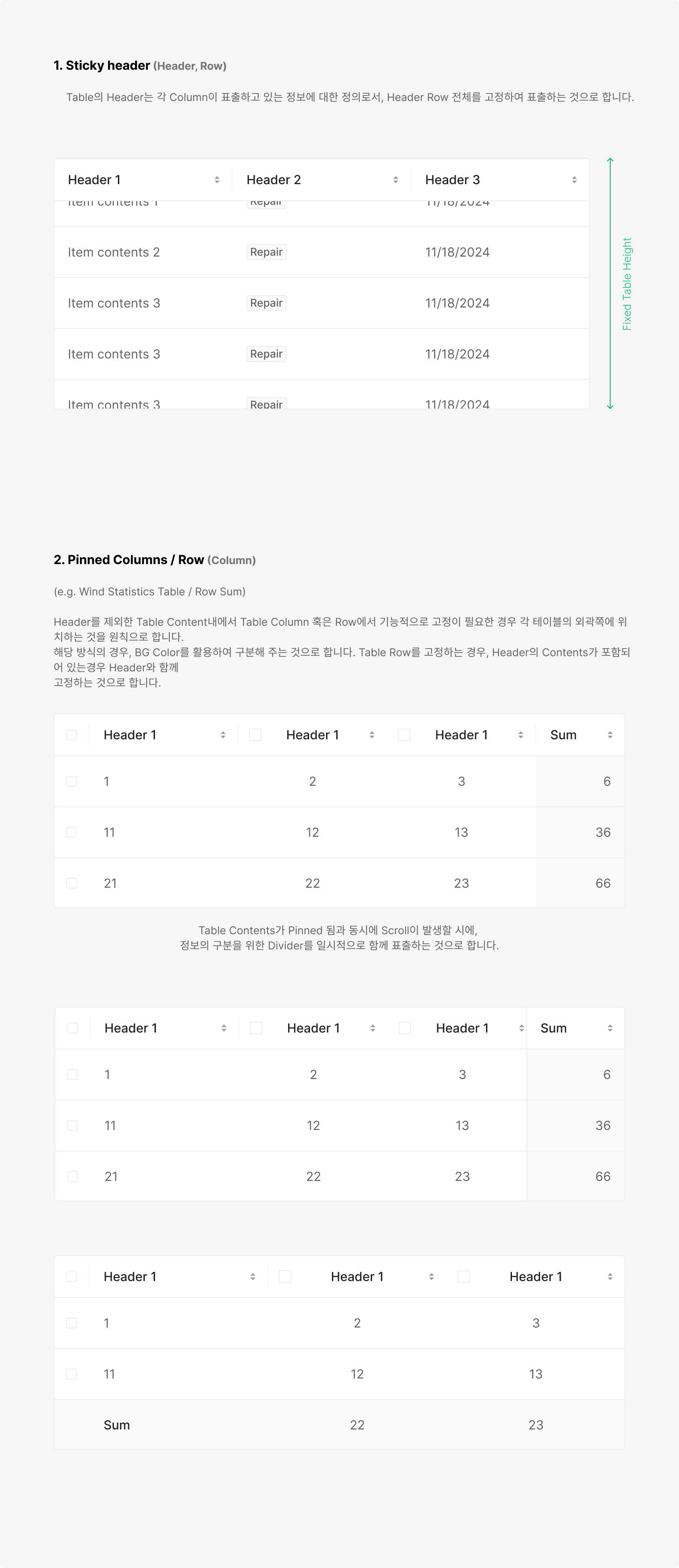 Table의 Contents는 기본적으로 Pagenation이 아닌 Scroll 방식으로 표출하는 것을 기본으로 하되, 기능적으로 Content의 Data를 이해하는데 있어서 필요한 정보를 고정 하여 표출 합니다.