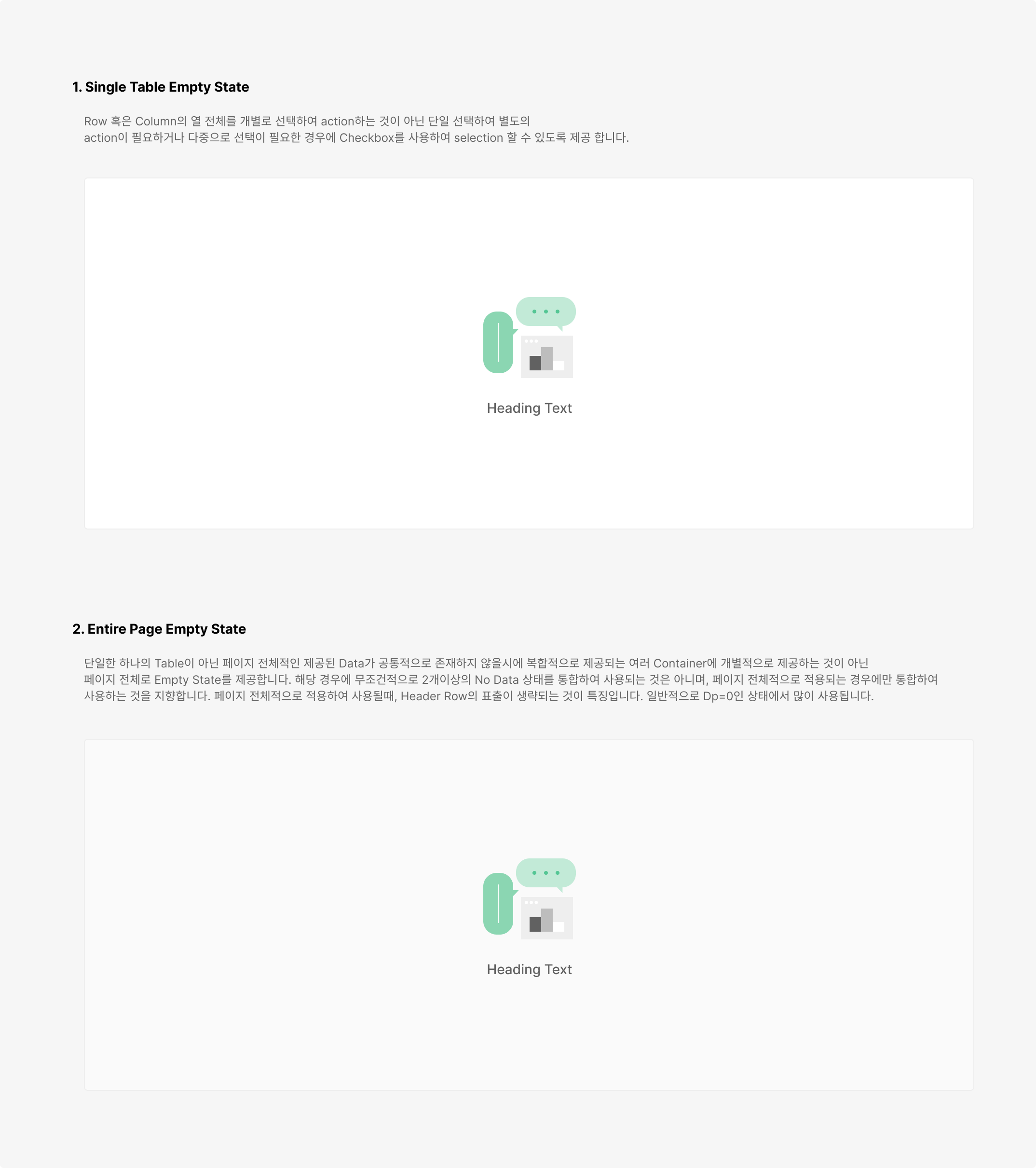 데이터가 없는 경우 특정한 Table의 Content가 비어있을 때 Empty State를 데이터가 없다는 것을 알려 나타내며 데이터가 아직 준비 중이라는 것을 표현 할 수 있습니다. Table의 특성에 따라 Empty State를 적용해 사용할 수 있으며, 필요한 경우 이미지와 CTA 등의 Empty State를 자유롭게 적용하여 사용할 수 있습니다.