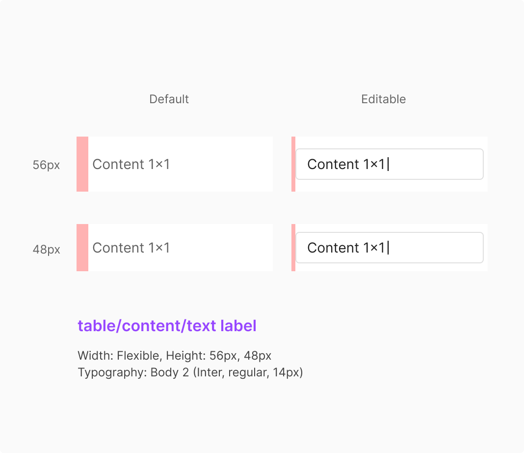 Text Label Type은 텍스트 기반 데이터를 표시하기 위한 가장 기본적인 Table Content 형태입니다. Default 상태에서는 읽기 중심의 정보를 안정적으로 전달하며, Editable 상태에서는 Input을 통해 직접 수정 가능한 구조로 확장할 수 있습니다.