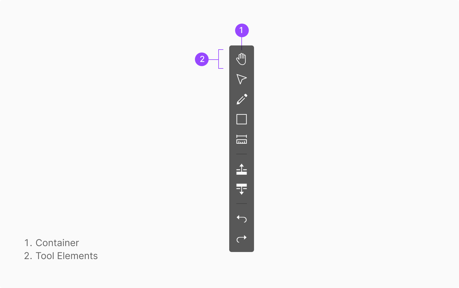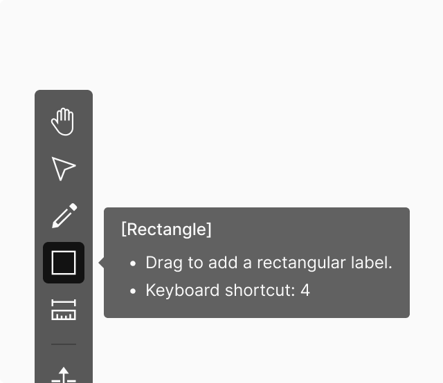 Toolbar내에서 제공하는 Icon 형태의 Tool들에서의 설명을 Tooltip으로 띄우는 것을 원칙으로 합니다. 해당 Tooltip 내에는 이름, 설명 가이드, 그리고 단축키에 대한 정보를 제공하는 것이 일반적입니다. 작업 과정에서의 별도의 설명이 필요하지 않는 직관적인 요소는 설명에 대한 생략이 가능하며, 이는 단축키도 마찬가지로 종속된 작업공간에서의 작업과정에서 별도의 단축키가 필요하지 않은 Tool의 경우 단축키에 대한 정보와 기능을 생략하는 것으로 합니다.