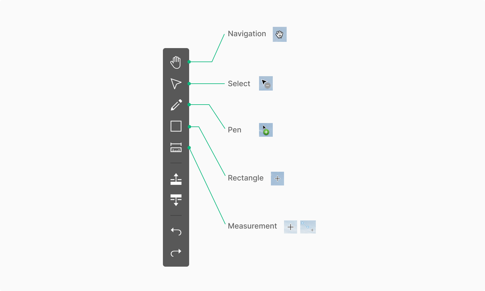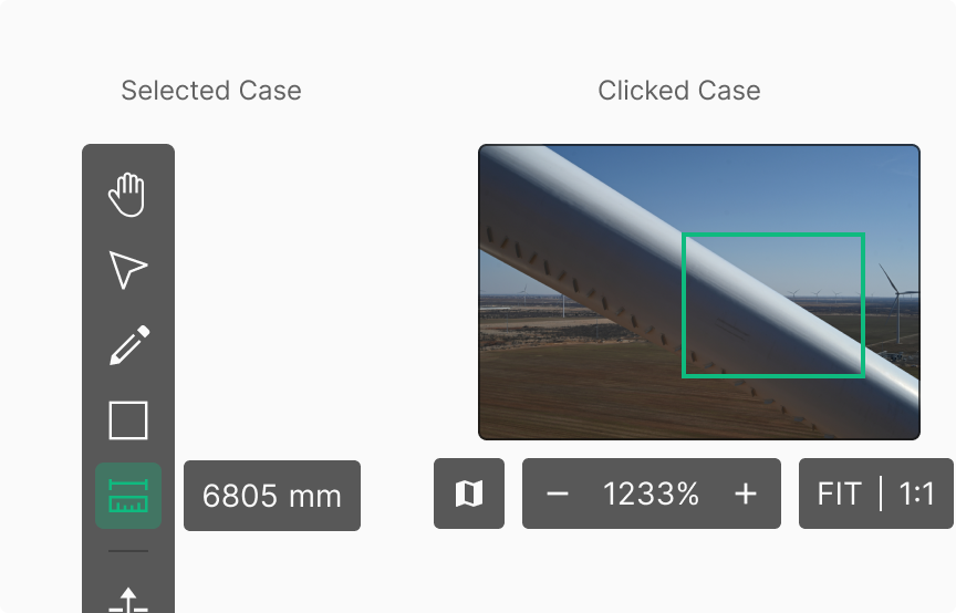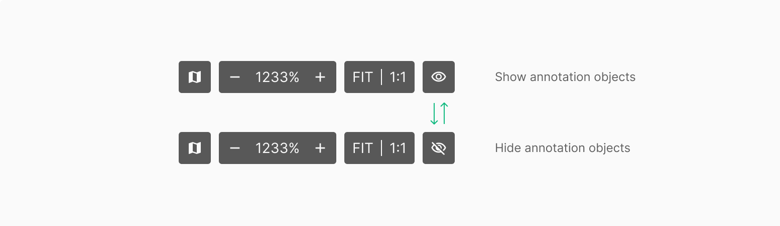 일반적으로 Bottom Toolbar에서 사용되는 Button의 경우 선택시 해당 동작을 수행할뿐 별도의 시각적 변화는 나타나지 않으나, Show / Hide의 기능의 경우 현재의 Annotation Object 표출 상태에 대한 현재 Viewer 상태를 직접적으로 나타내주어 직관적으로 알 수 있도록 표현 되는 것이 특징입니다.