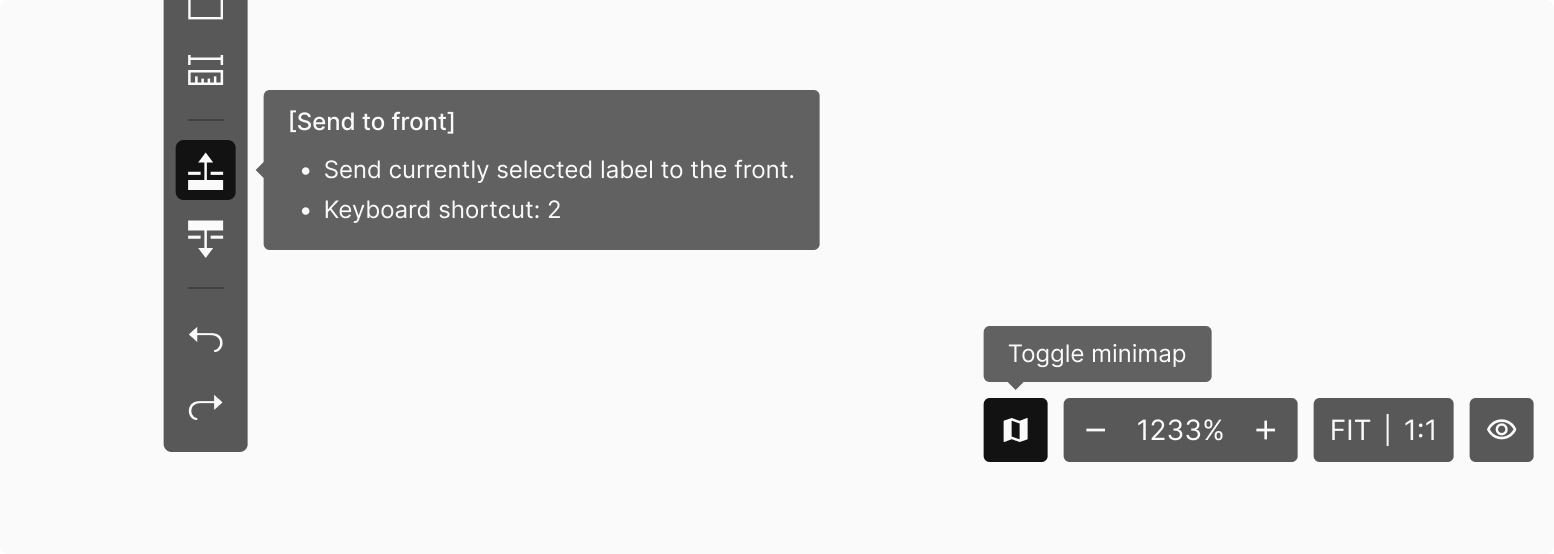 Toolbar 내의 기능 요소들을 개별로 Hover 하였을때 작업툴에 대한 설명의 Tooltip을 띄우는 것을 원칙으로 하되 경우에 따라 생략 가능합니다.
