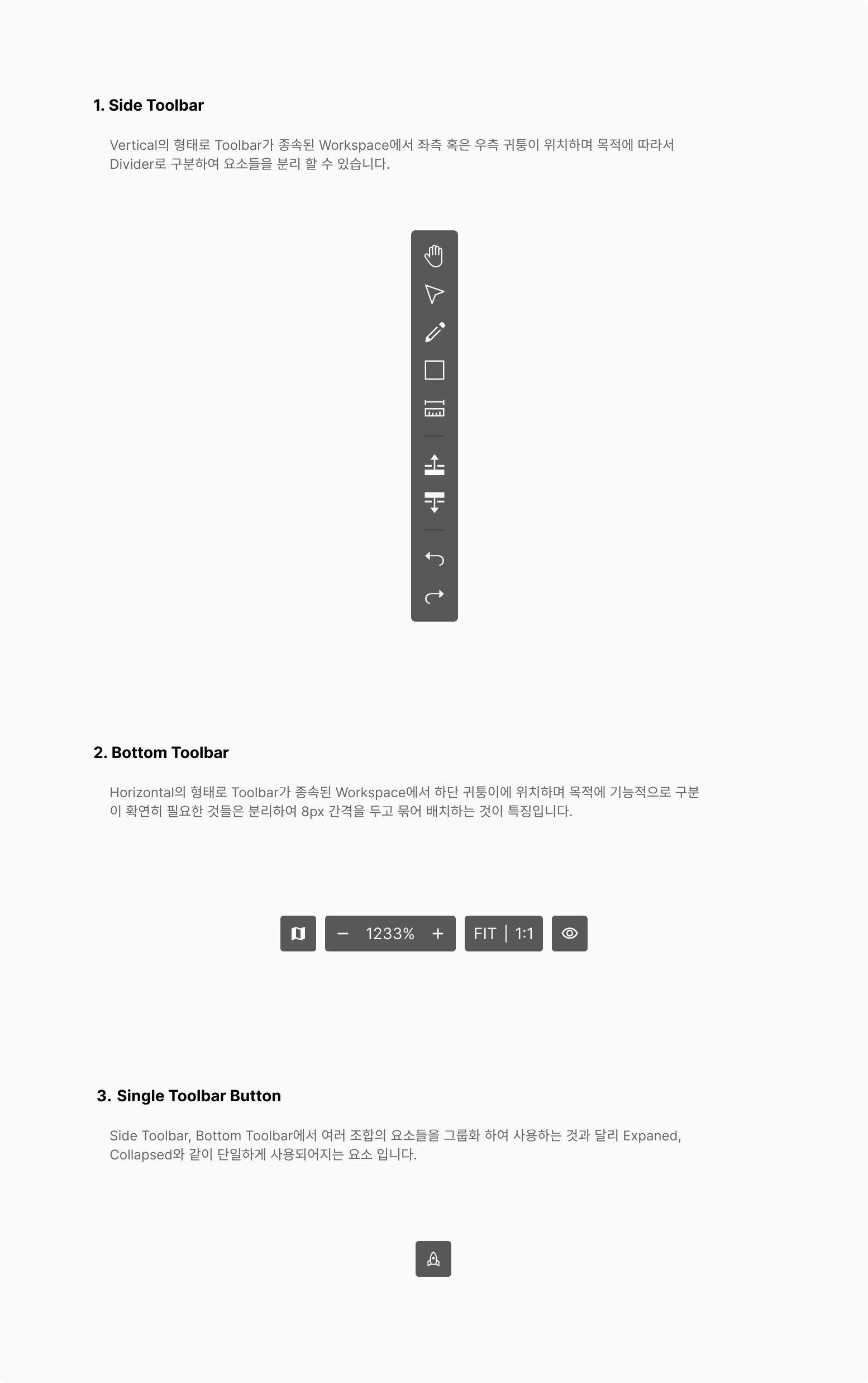 Horizontal의 형태로 Toolbar가 종속된 Workspace에서 하단 귀퉁이에 위치하며 목적에 기능적으로 구분이 확연히 필요한 것들은 분리하여 8px 간격을 두고 묶어 배치하는 것이 특징입니다.